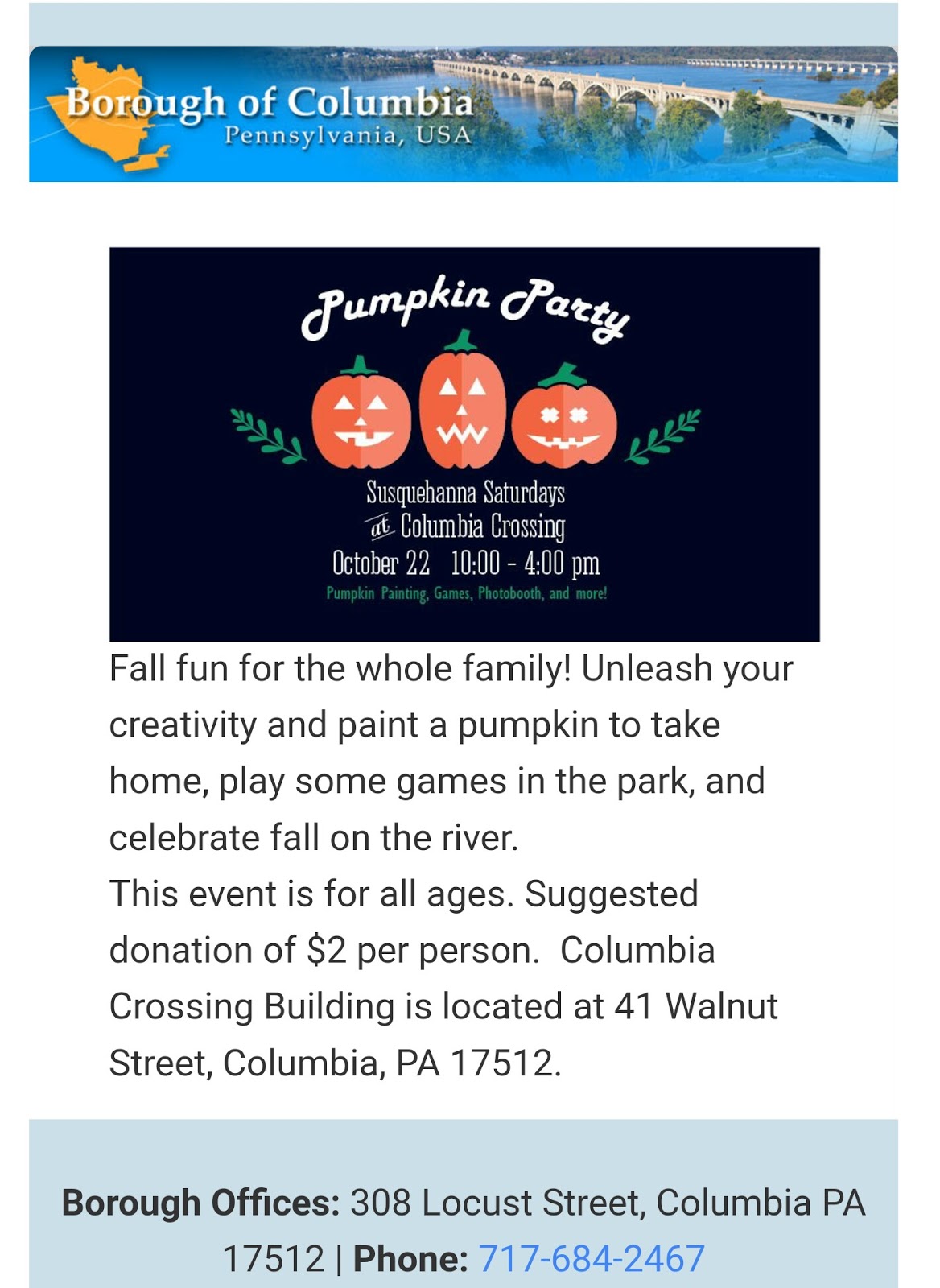 Pumpkin painting party at Columbia Crossing Saturday, October 22 Share this: Share on X (Opens in new window) X Share on Facebook (Opens in new window) Facebook More Share on Bluesky (Opens in new window) Bluesky Share on X (Opens in new window) X Like Loading... Related