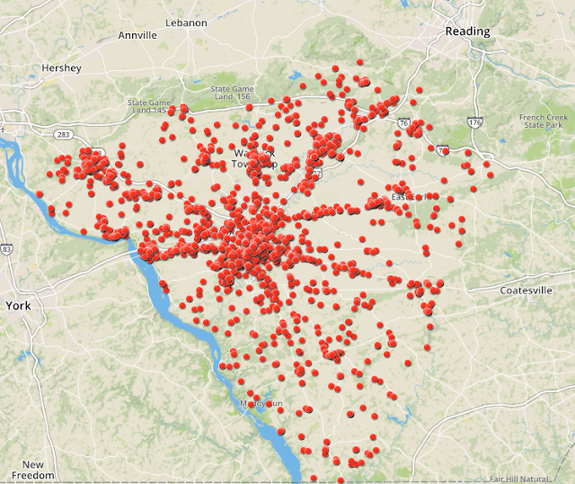 The map consists of Lancaster County-Wide Communications data, specifically emergency dispatches/responses to reported overdose incidents, from January 1, 2014 to November 1, 2016. It can be accessed HERE.