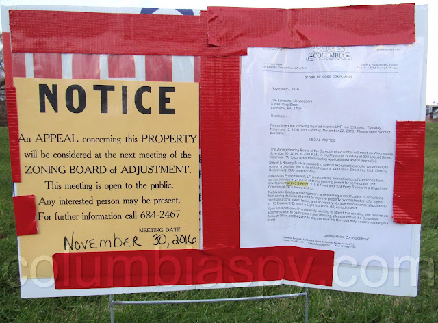 LEGAL NOTICE The Zoning Hearing Board of the Borough of Columbia will meet on Wednesday, November 30, 2016, at 7:00 P.M., in the Municipal Building at 308 Locust Street, Columbia, PA, to consider the following application(s) and/or appeal(s):