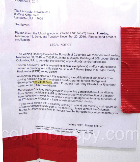 LEGAL NOTICE The Zoning Hearing Board of the Borough of Columbia will meet on Wednesday, November 30, 2016, at 7:00 P.M., in the Municipal Building at 308 Locust Street, Columbia, PA, to consider the following application(s) and/or appeal(s):
