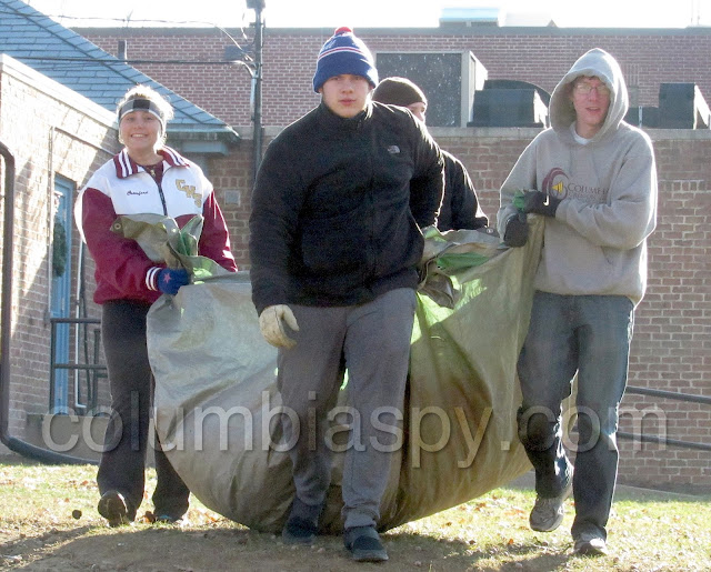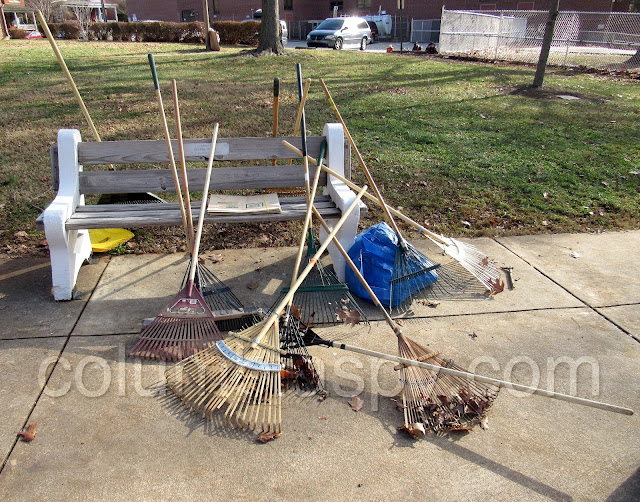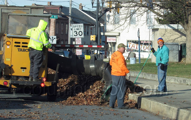 Many, many leaves left Locust Street Park this morning, thanks to the efforts of the Columbia Park Rangers, the National Honor Society, the Lions Club, The Sunsnappers, the Boy Scouts, and Columbia Borough workers. Loads of leaves were raked into piles and then hauled on tarps to curbside, where they were picked up by a borough leaf collection vehicle.
