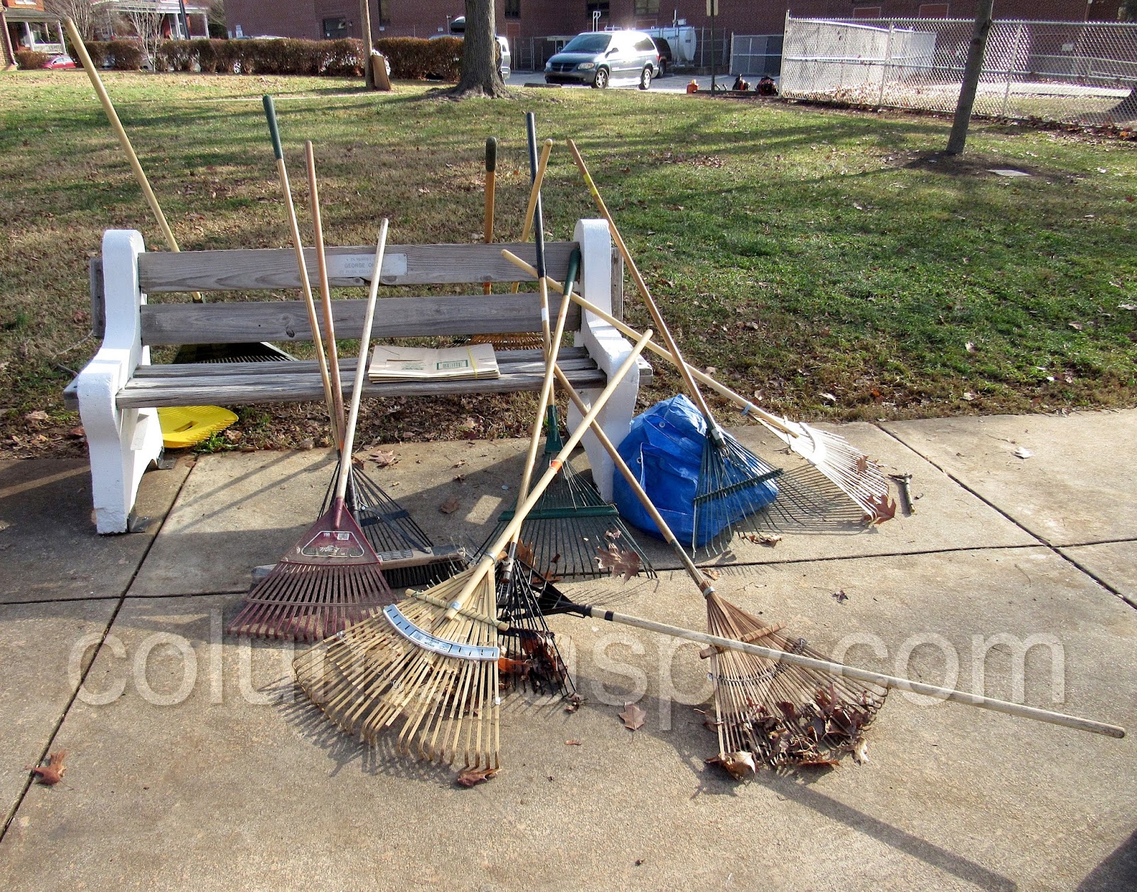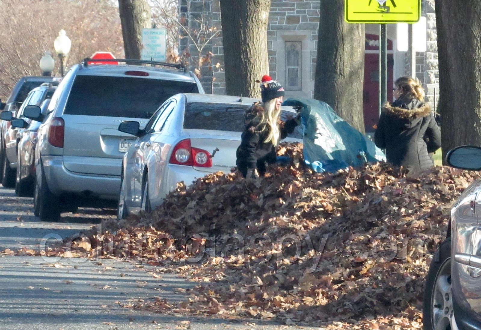 Many, many leaves left Locust Street Park this morning, thanks to the efforts of the Columbia Park Rangers, the National Honor Society, the Lions Club, The Sunsnappers, the Boy Scouts, and Columbia Borough workers. Loads of leaves were raked into piles and then hauled on tarps to curbside, where they were picked up by a borough leaf collection vehicle.