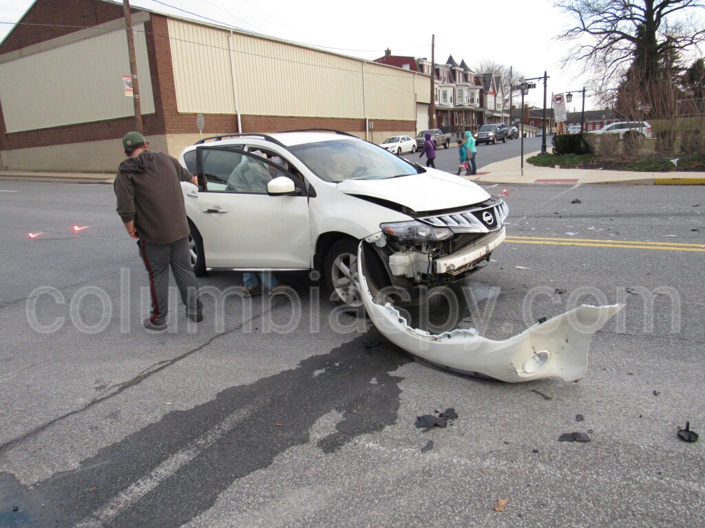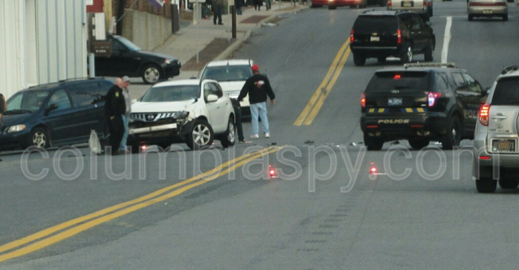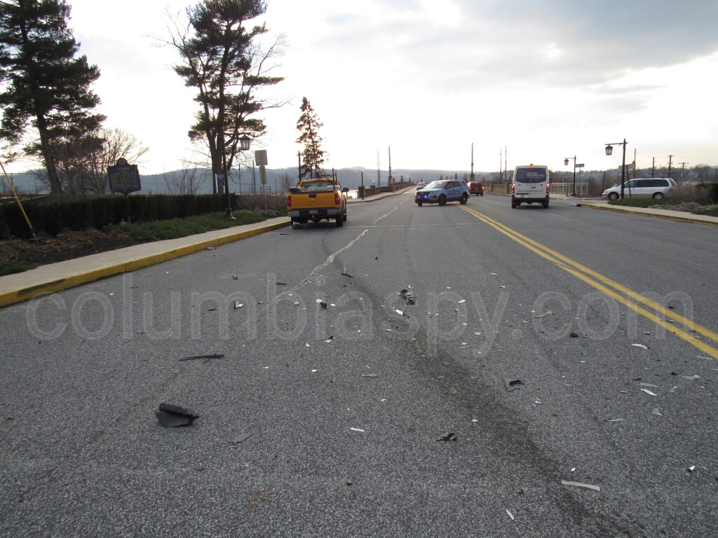 A two-vehicle accident occurred Thursday shortly before 3 p.m. near the entrance to the Veterans Memorial Bridge. According to witnesses, the driver of a Nissan Murano traveling south on North Second Street failed to stop at a stop sign and was hit by a Chevy Silverado heading west on Route 462. Both vehicles sustained front end damage, and an air bag deployed in the Nissan. The Nissan driver told Columbia Spy that his vehicle was worth about $7,000. He believed it to be totaled. The intersection was closed for over an hour as personnel investigated.