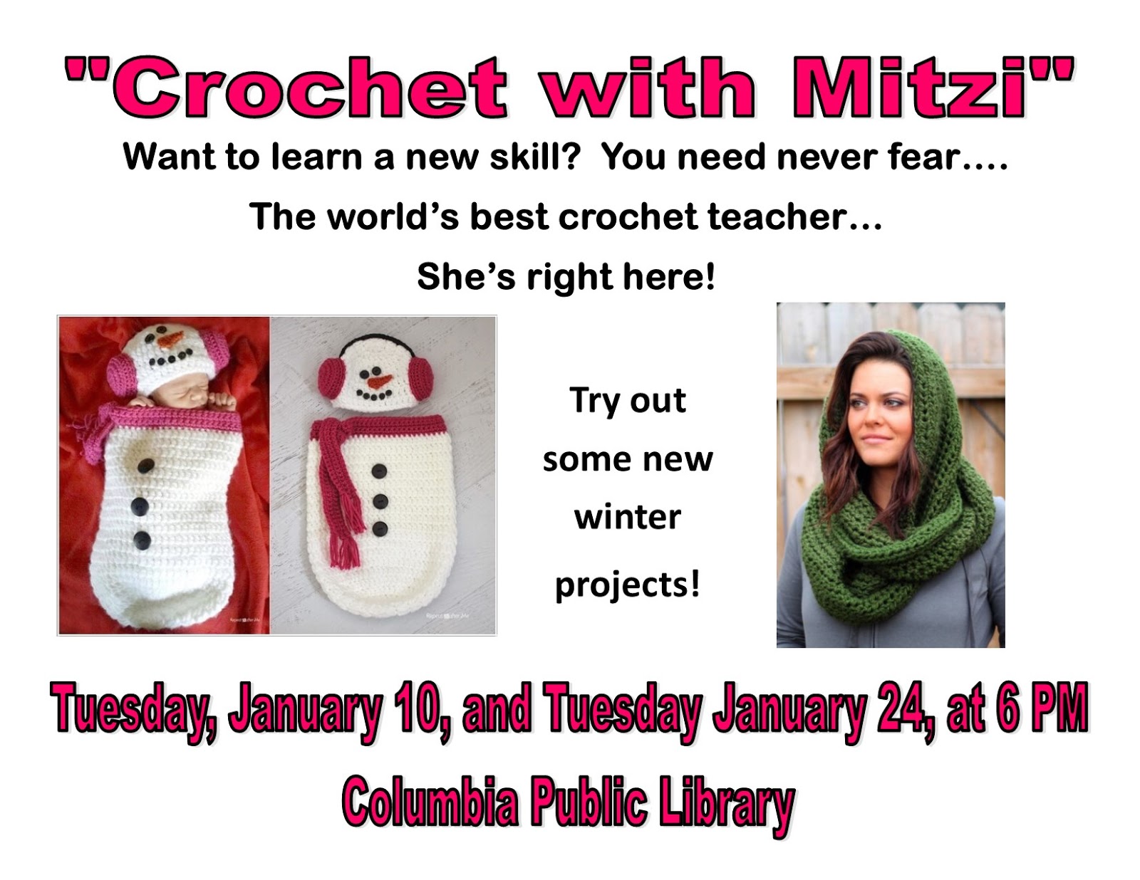 Crochet with Mitzi at the Library on Tuesday, January 24 Share this: Share on X (Opens in new window) X Share on Facebook (Opens in new window) Facebook More Share on Bluesky (Opens in new window) Bluesky Share on X (Opens in new window) X Like Loading... Related