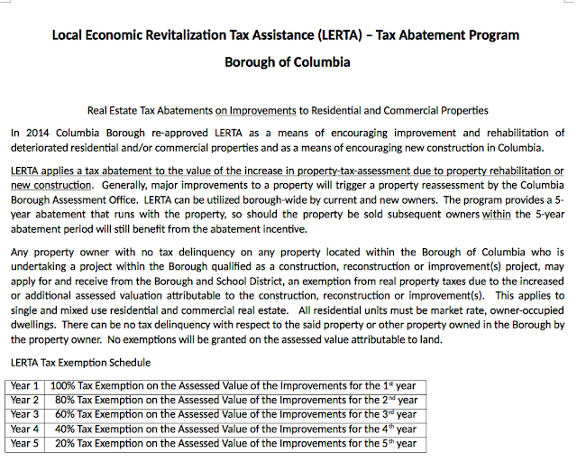 According to Borough Consultant Rebecca Denlinger, Columbia has had the LERTA program in place for three years, and it is currently in its fourth year. Greg Sahd said that only one application was received recently. Denlinger said the program works in other communities but is not sure why it’s not working in Columbia. Developers are interested in borough properties but hesitate due to financial issues, Denlinger said. The 5-year LERTA abates taxes on a property; i.e., only the taxes on improvements made on the property. Base taxes are still paid. On the first year after improvements are made, the abatement is 100%. (No taxes are paid on improvements.) Year two: 80%. Year three: 60%. Year four: 40%. Year five: 20%. After the fifth year, the property comes fully back onto the tax rolls.