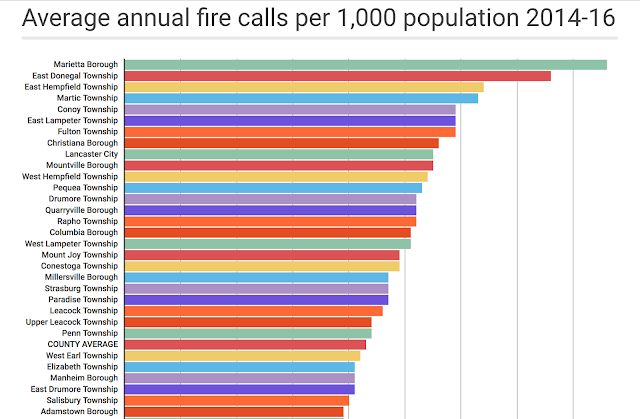 Columbia Borough averaged 51 annual fire calls per 1,000 population in 2014-16, according to THIS LNP article. The county average was 43. Marietta Borough was the highest – twice the average – at 86. Akron was the lowest: 19.