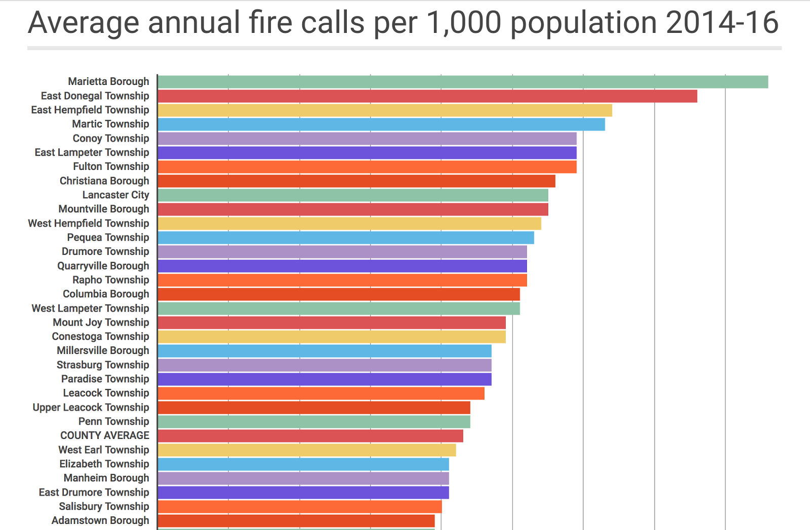 Columbia Borough averaged 51 annual fire calls per 1,000 population in 2014-16, according to THIS LNP article. The county average was 43. Marietta Borough was the highest – twice the average – at 86. Akron was the lowest: 19.
