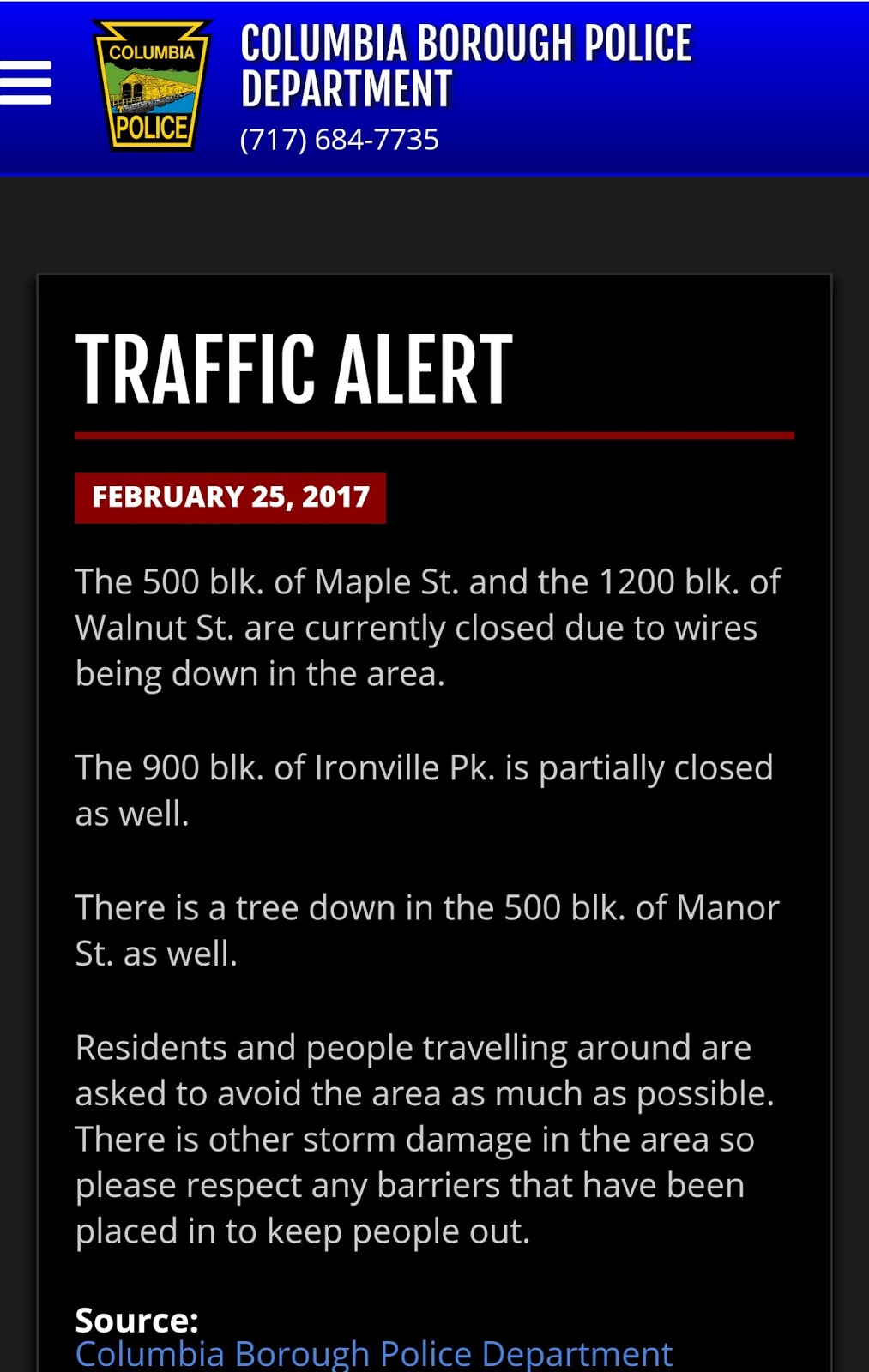 TRAFFIC ALERT – Columbia Borough Police Share this: Click to share on X (Opens in new window) X Click to share on Facebook (Opens in new window) Facebook More Click to share on Bluesky (Opens in new window) Bluesky Click to share on X (Opens in new window) X Like Loading... Related