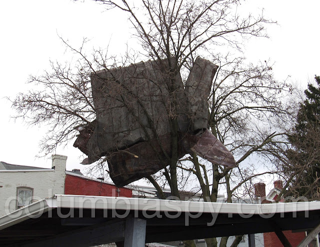Yes, that’s a roof in a tree in the 300 block of Avenue F