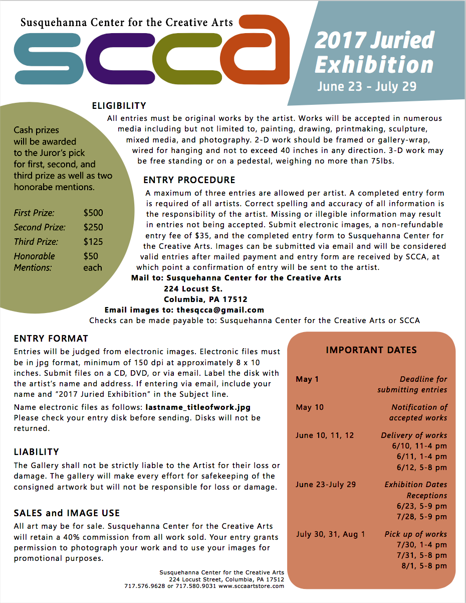 The Susquehanna Center for the Creative Arts is hosting a juried show at 224 Locust Street, Columbia. First Prize is $500.