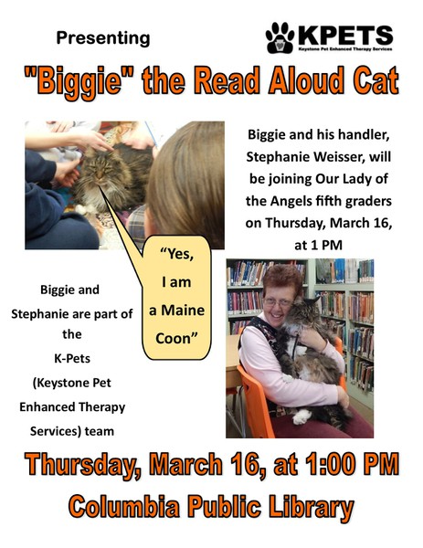 Biggie the cat at the library Thursday, March 16 at 1 p.m. Share this: Share on X (Opens in new window) X Share on Facebook (Opens in new window) Facebook More Share on Bluesky (Opens in new window) Bluesky Share on X (Opens in new window) X Like Loading... Related