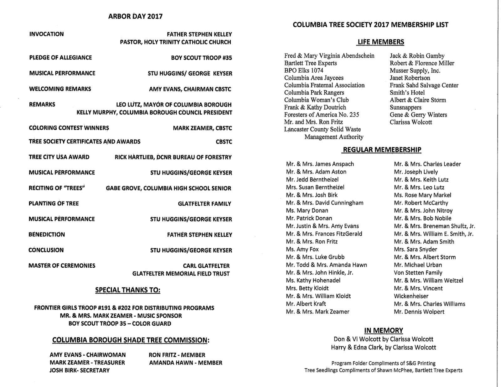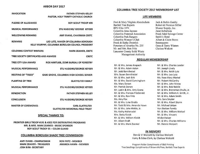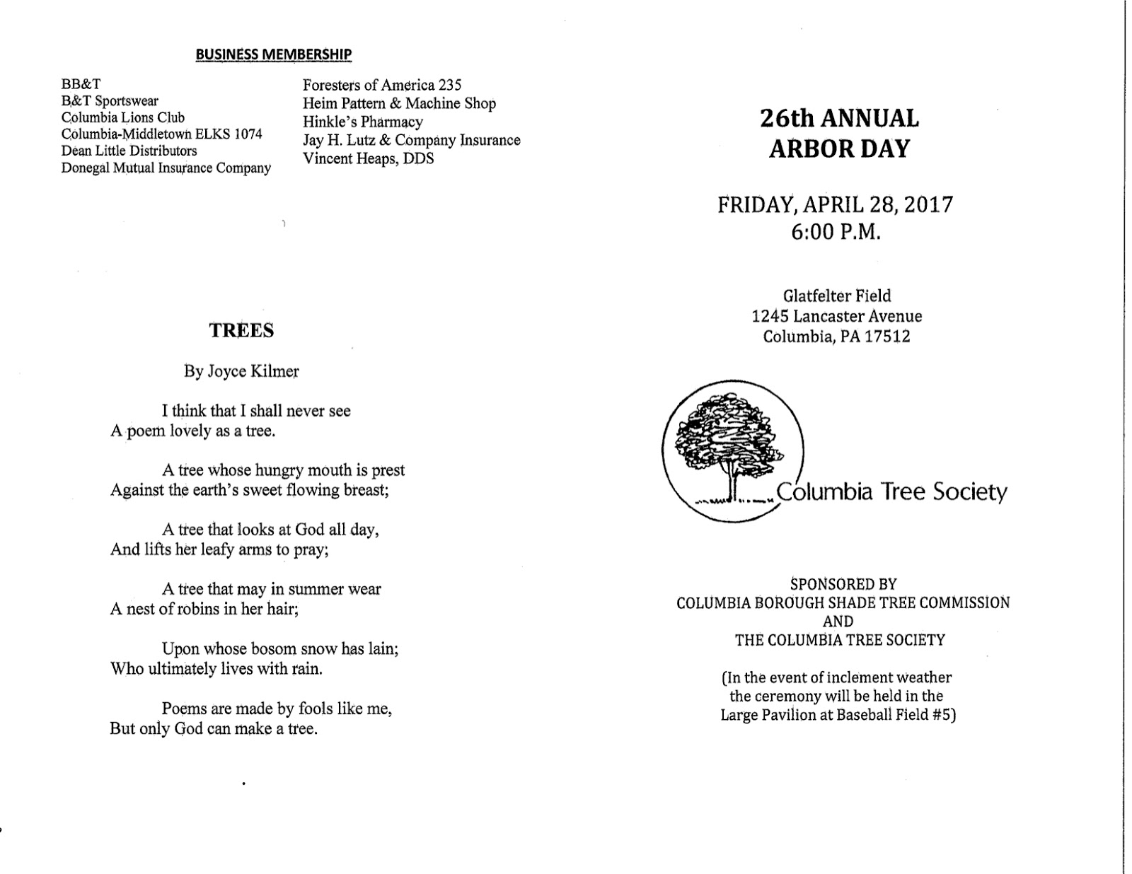 The Columbia Borough Shade Tree Commission and the Columbia Tree Society will conduct their 26th annual Arbor Day celebration at Glatfelter Memorial Field, on Friday April 28, 2017 starting at 6 p.m.