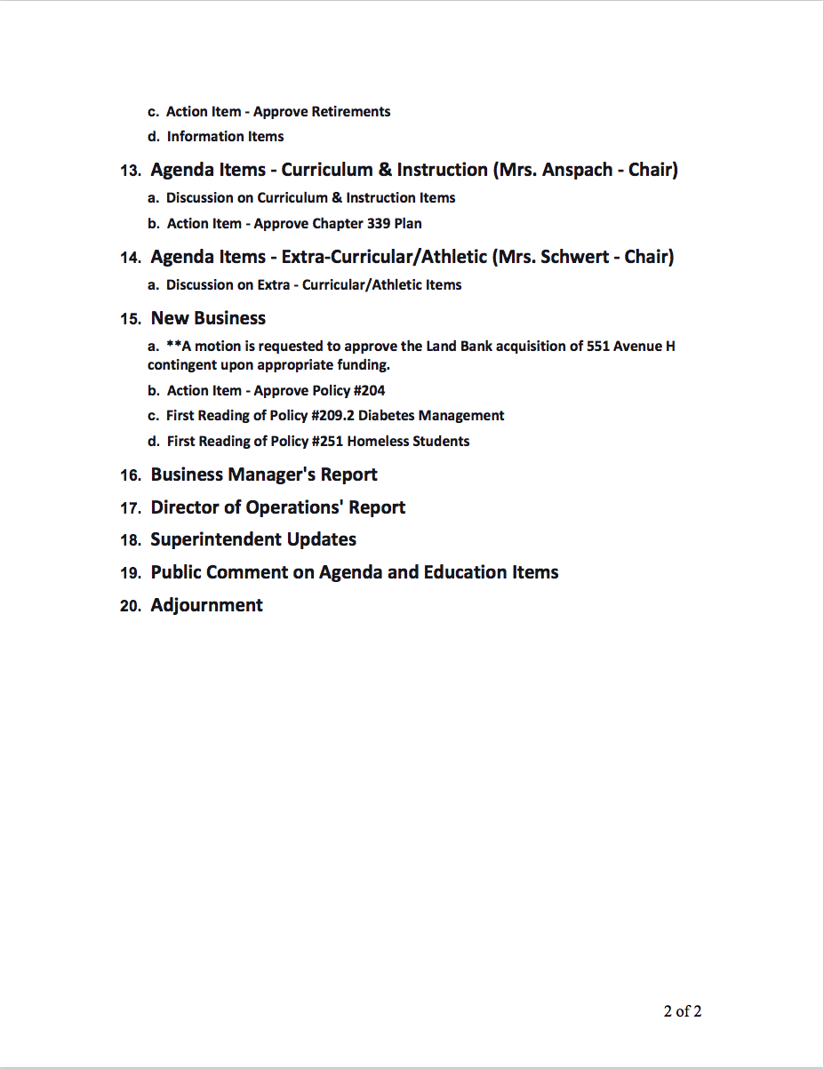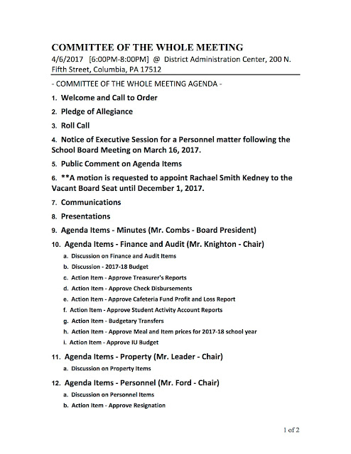 Columbia School Board’s Committee of the Whole meeting will convene at 6 p.m. A preliminary agenda for this meeting is shown below. Item 6 of the agenda lists a request for a motion to appoint Rachael Smith Kedney to the vacant board seat until December 1, 2017. That seat was vacated when Iris Garrido resigned last month.