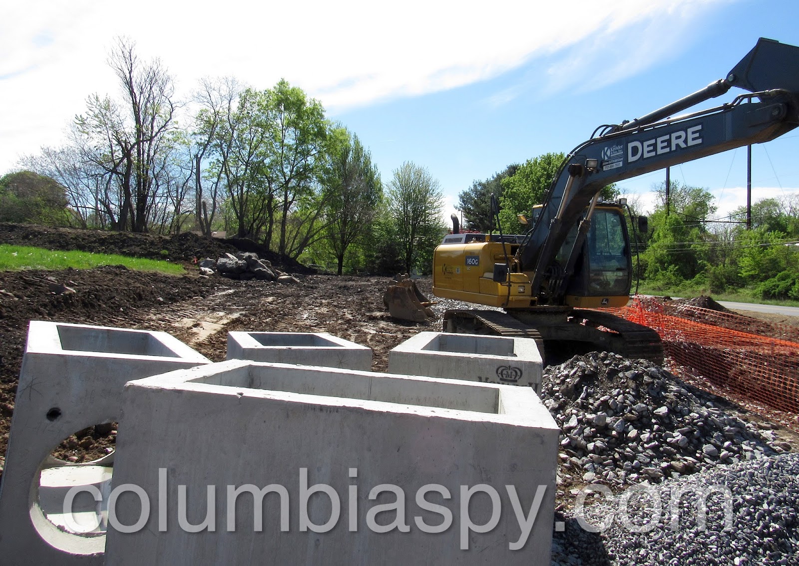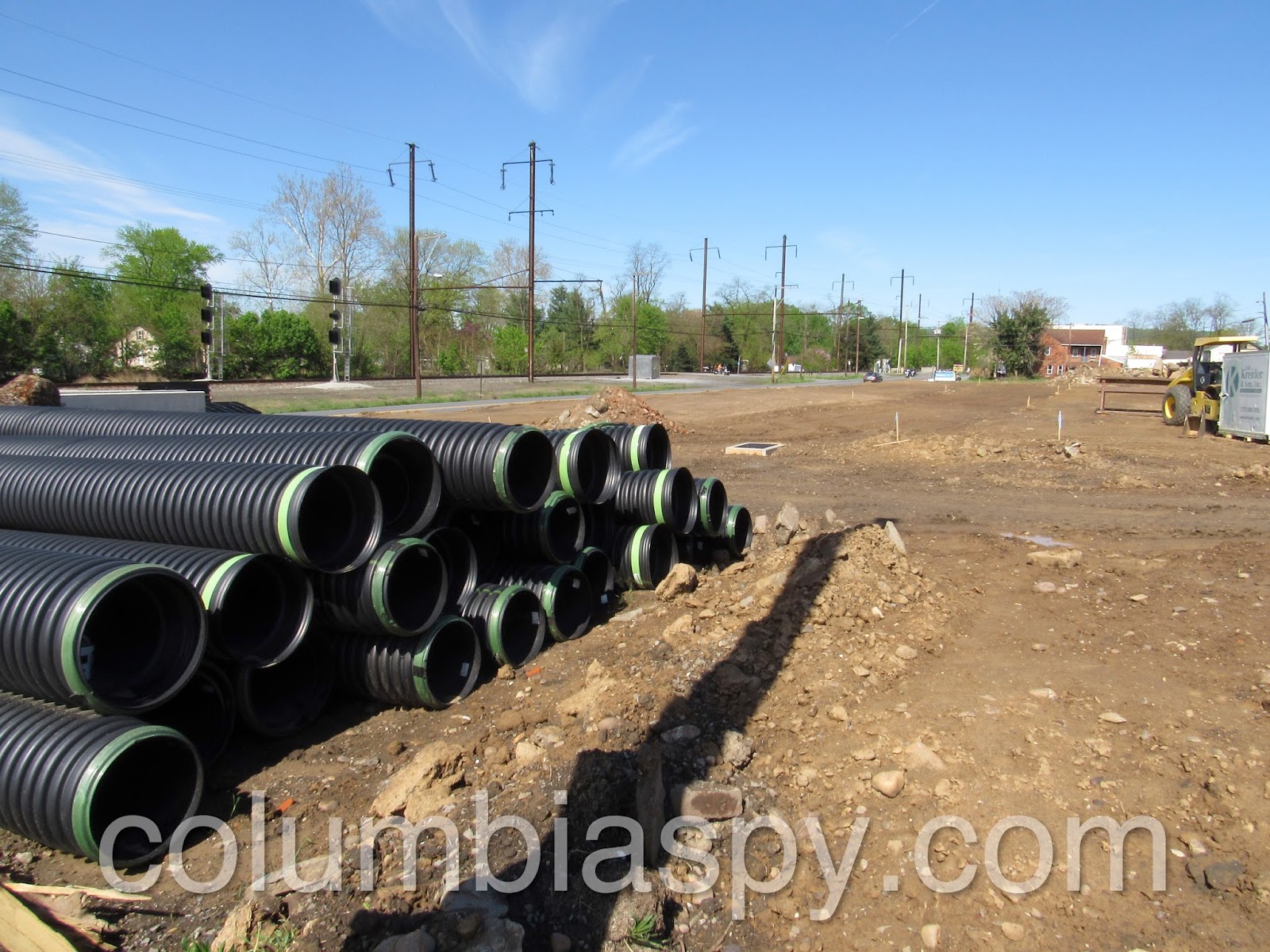 Columbia Spy shot the following photos today showing the progress of construction for the planned storage units along Front Street. Excavation continues and drainage lines are beginning to be installed. The next step will most likely be pouring concrete slabs.