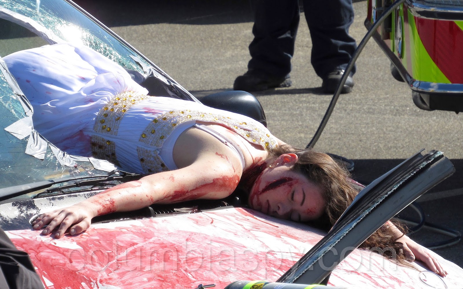 Student actors from the Columbia High School Drama Club enacted a realistic scene, with some covered in blood. One was partially ejected through the windshield and was lying motionless.