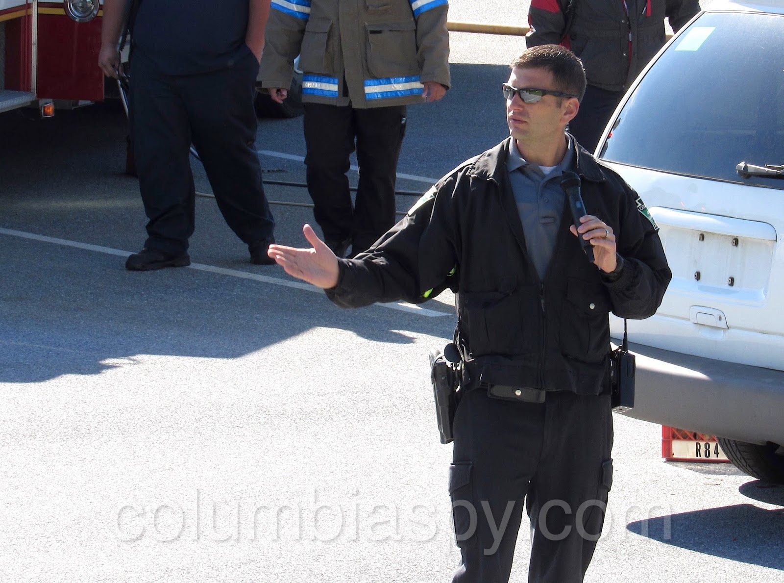 The fire department, EMS, and police demonstrated their response to a vehicle accident. School Resource Officer Troy Engle addressed the students who stood quietly absorbing the scene.
