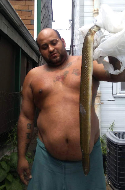 Angel Rodriguez of Columbia with the river eel he caught on Saturday.