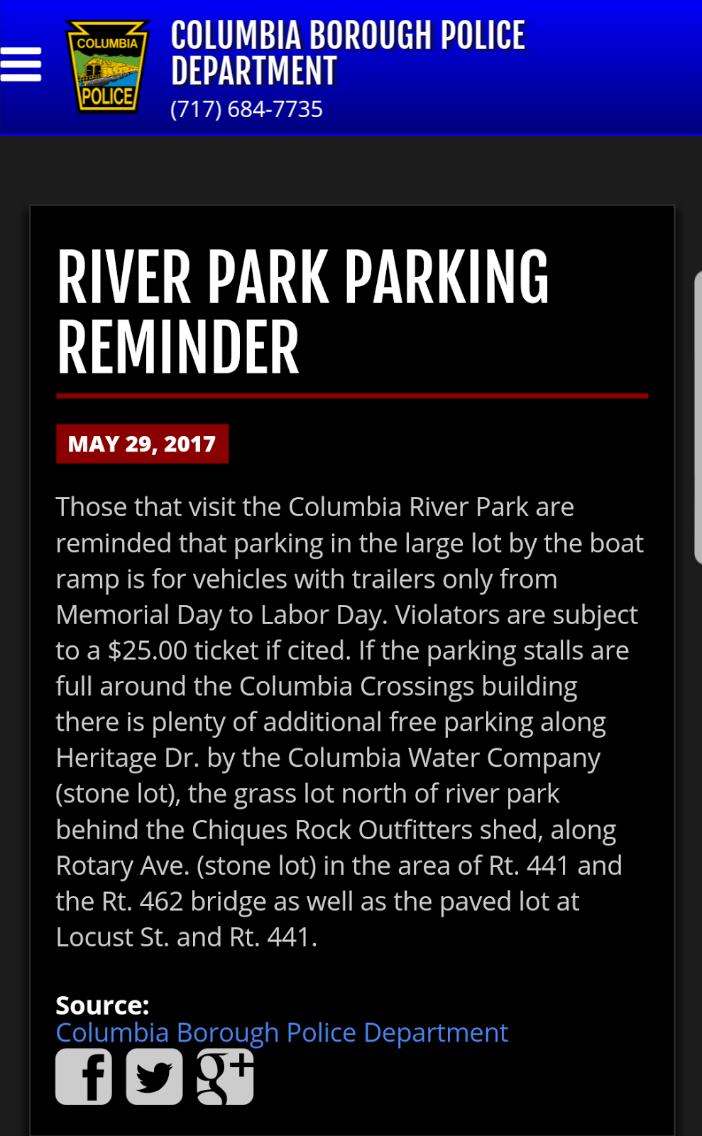 River Park Parking Reminder Share this: Share on X (Opens in new window) X Share on Facebook (Opens in new window) Facebook More Share on Bluesky (Opens in new window) Bluesky Share on X (Opens in new window) X Like Loading... Related