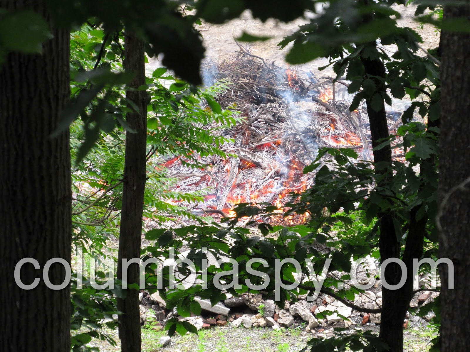 Columbia Spy noticed a large cloud of gray smoke billowing from the tree line near Laurel Hill Memorial Gardens at about 4 p.m. today. On closer investigation, it was noted that two piles of limbs and brush were burning on a property next to the cemetery. (See map below.) Although a person was present in the general vicinity of the fires, Columbia Borough has an ordinance against open burning. A member of the fire company tells the Spy that open burning is not permitted without special permission from the fire chief. For now, we’ll assume permission was given in this case.