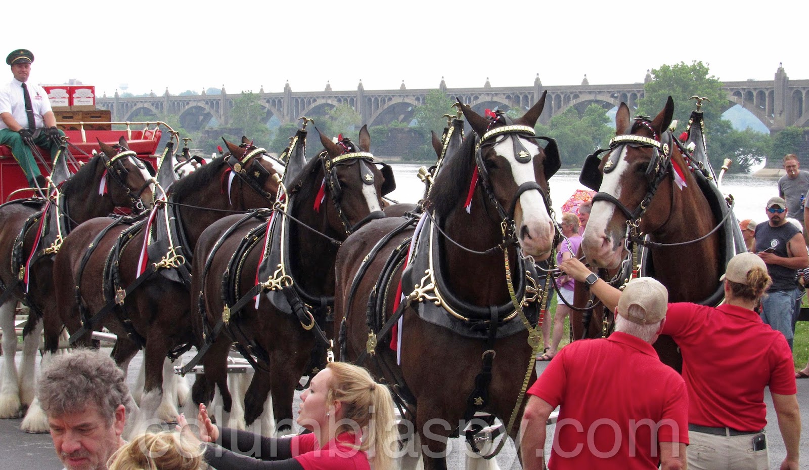 According to an article in the York Daily Record describing the events from last week, here is a description of the Wrightsville Parade Route:”The Wrightsville parade is scheduled to step off from John Wright Restaurant at 2 p.m. on June 17. The horses will travel down North Front Street to the area of Lemon and Willow streets, where they will turn around and head back on Front Street to Hellam Street. The route continues onto Third Street, makes a right onto Walnut Street and then heads back to John Wright Restaurant.”The horses did not cross the River. Still, what an amazing spectacle! Thank you for the pictures!