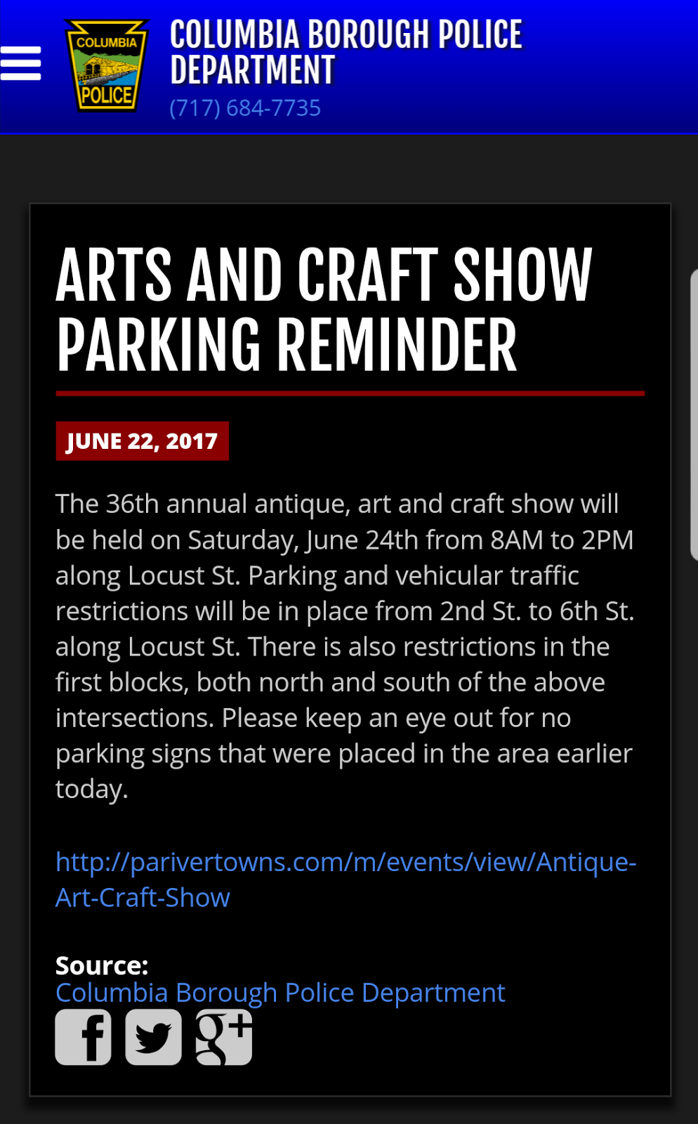 0 thoughts on “Parking and Traffic Restrictions for Saturday's ARTS & CRAFTS Show”