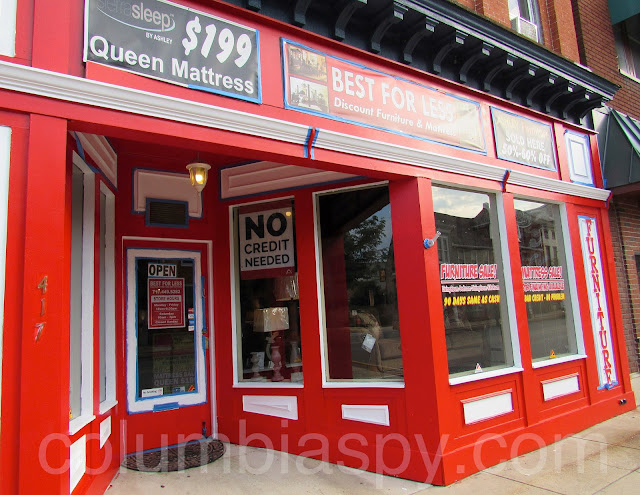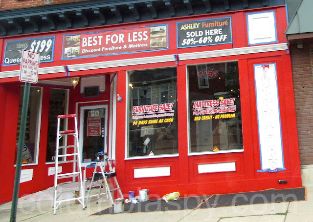 As shown in the photos below, painters were busy this week applying several coats of brilliant red paint to the exterior of the furniture store at 417 Locust Street, located in the heart of Columbia’s historic district. The last two photos show the most recent stage of the project. When painting is finished, the store should be strikingly visible, far and wide, hither and yon. Adjacent buildings will pale in comparison.