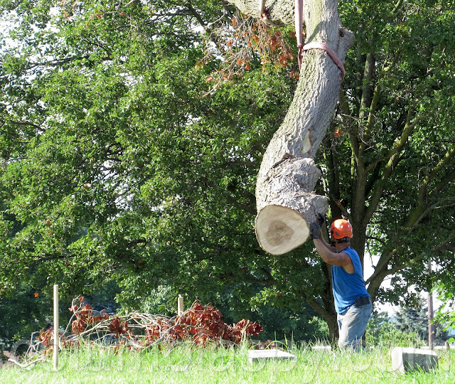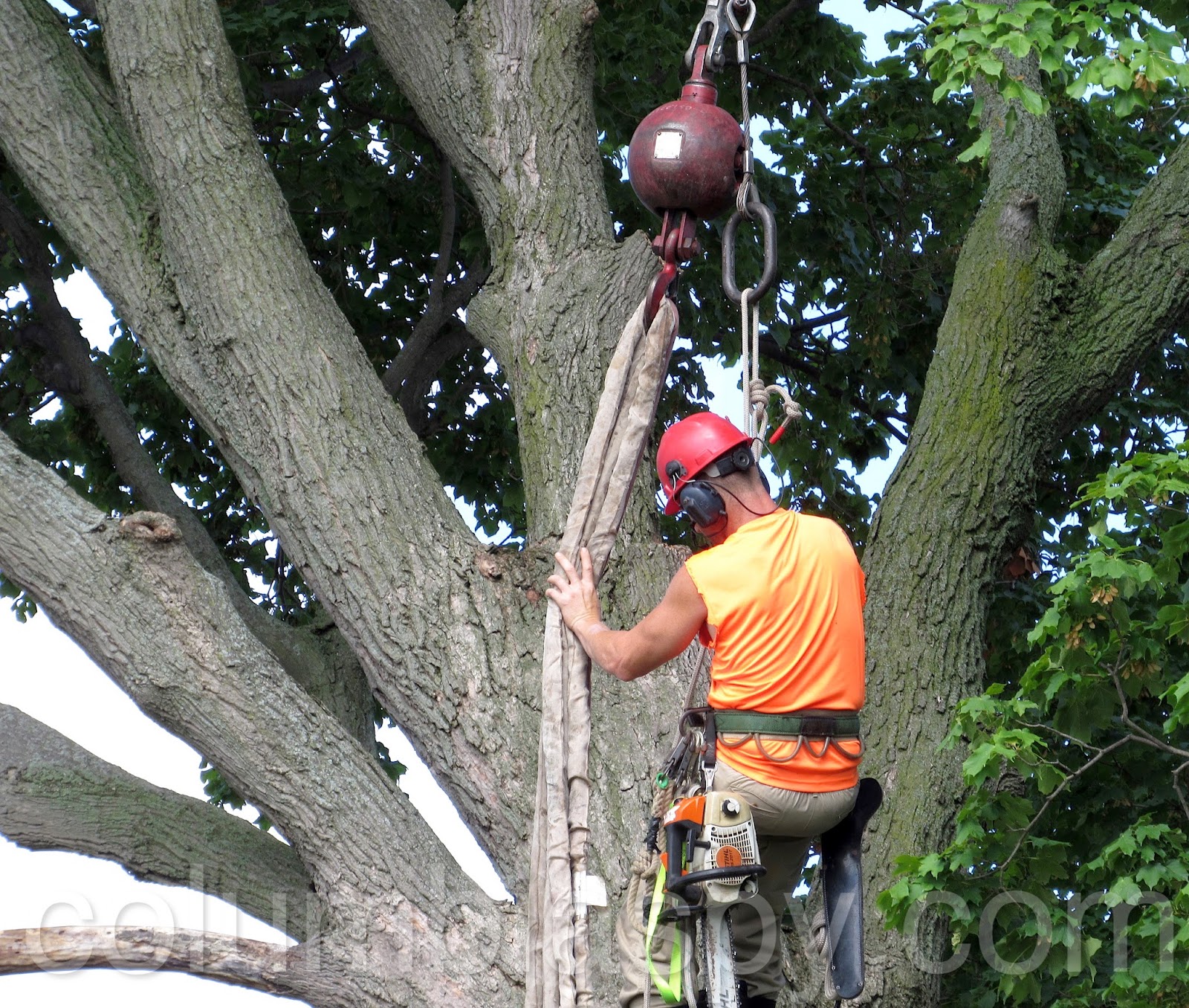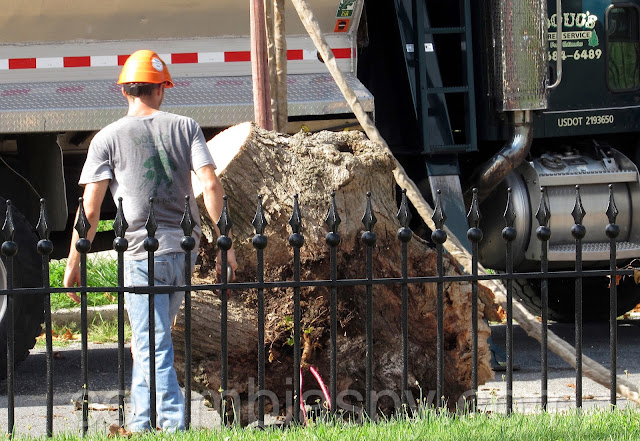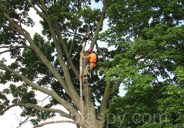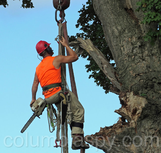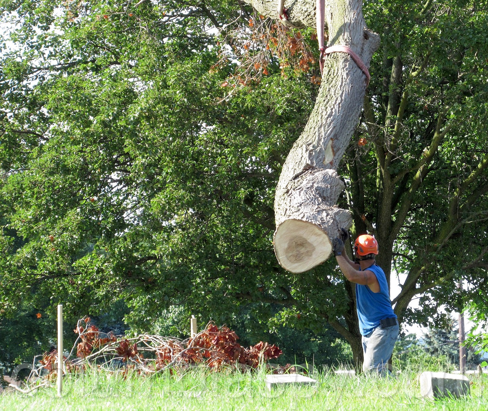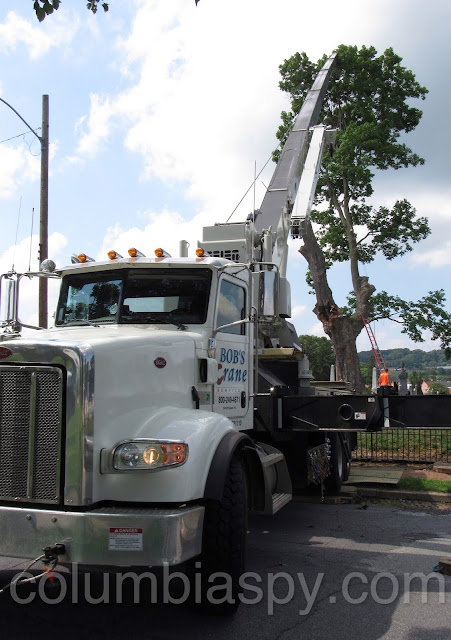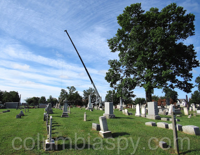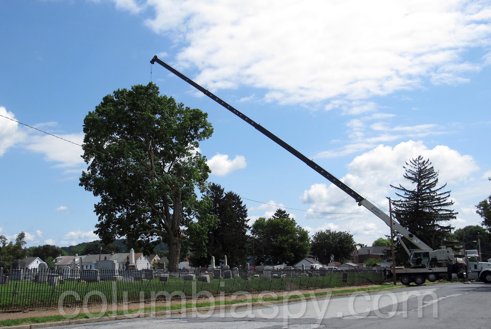 Workers from Doug’s Tree Service spent the afternoon sawing apart a rotted tree at Mount Bethel Cemetery. A few weeks ago, a large limb fell from the aging tree. Also on scene was a 120-foot crane from Bob’s Crane. At $200 an hour, the crane allowed workers to reach extreme high points of the tree. A representative of the cemetery reckoned the tree’s age to be about 100 years old. The bill from Doug’s Tree Service is estimated at $1,900, in addition to costs of operating the crane. Several trees have been removed from the cemetery within the past year due to rot and storm damage.