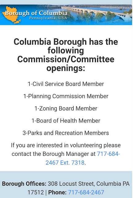 Columbia Borough has commission/committee openings Share this: Share on X (Opens in new window) X Share on Facebook (Opens in new window) Facebook More Share on Bluesky (Opens in new window) Bluesky Share on X (Opens in new window) X Like Loading... Related