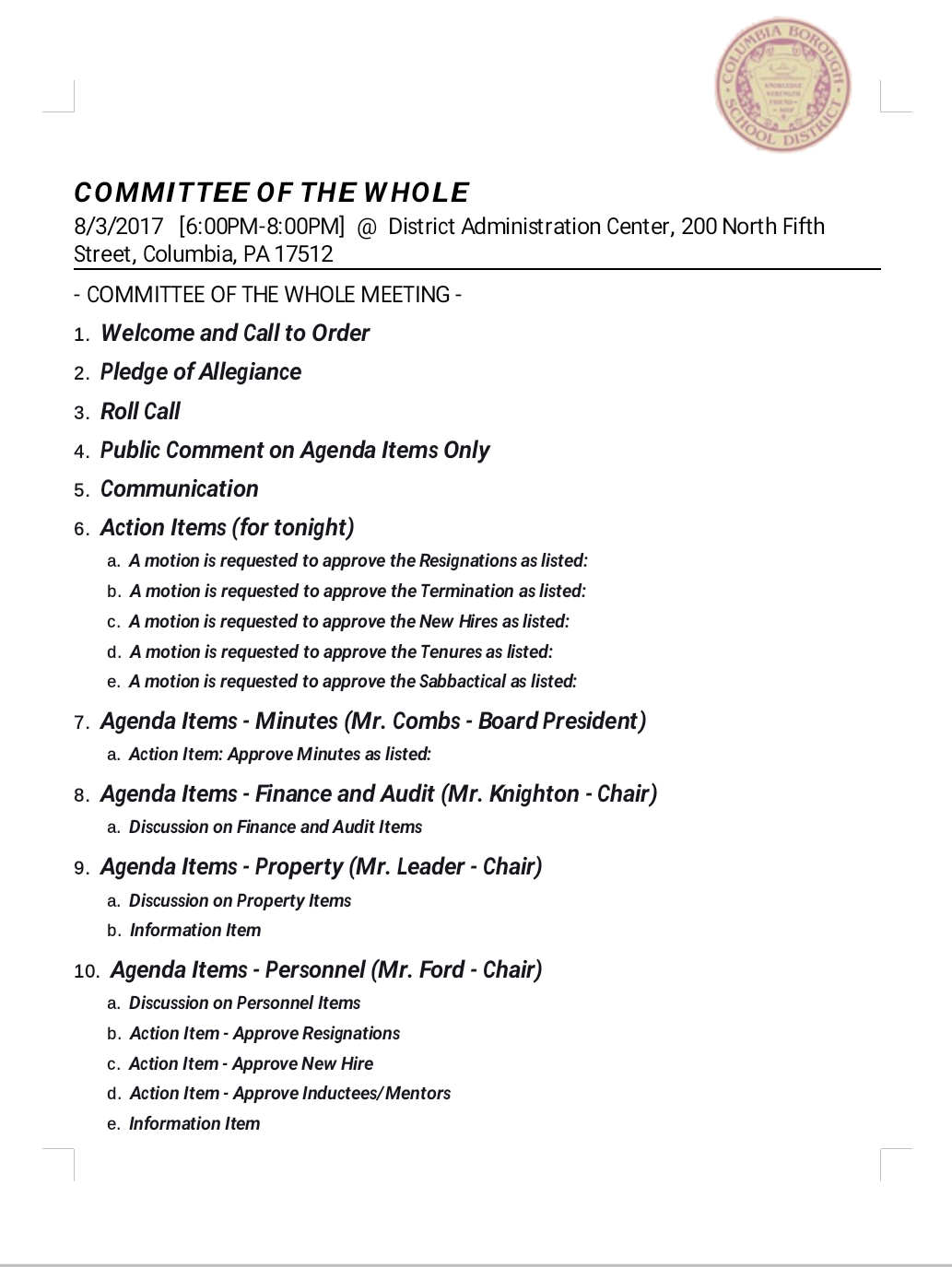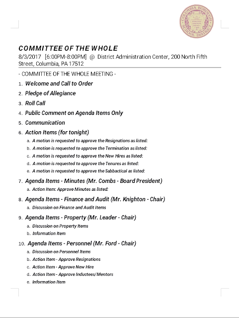 Columbia School Board Committee of the Whole Agenda August 3, 2017 Share this: Share on X (Opens in new window) X Share on Facebook (Opens in new window) Facebook More Share on Bluesky (Opens in new window) Bluesky Share on X (Opens in new window) X Like Loading... Related