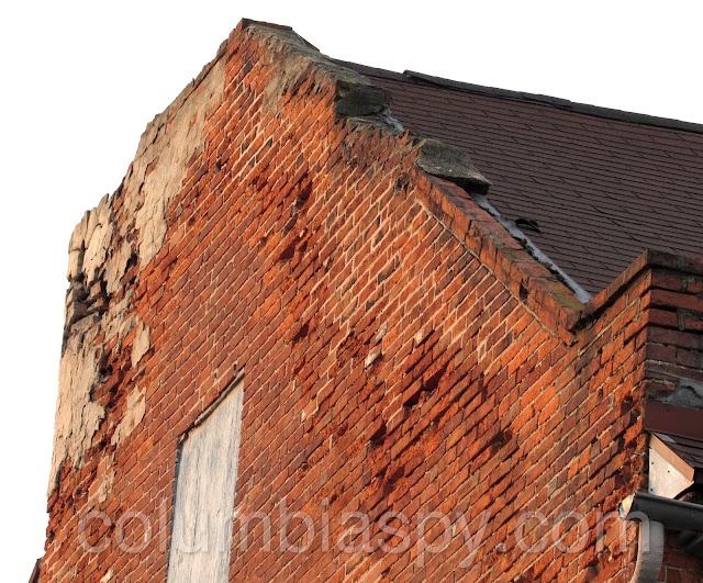 2. Building was hit by lightning, causing the bricks to fall. But by the looks of it, it would be falling soon anyway. How is this code compliant? half the bricks are decaying and looks like the rest of that side could come down at anytime.