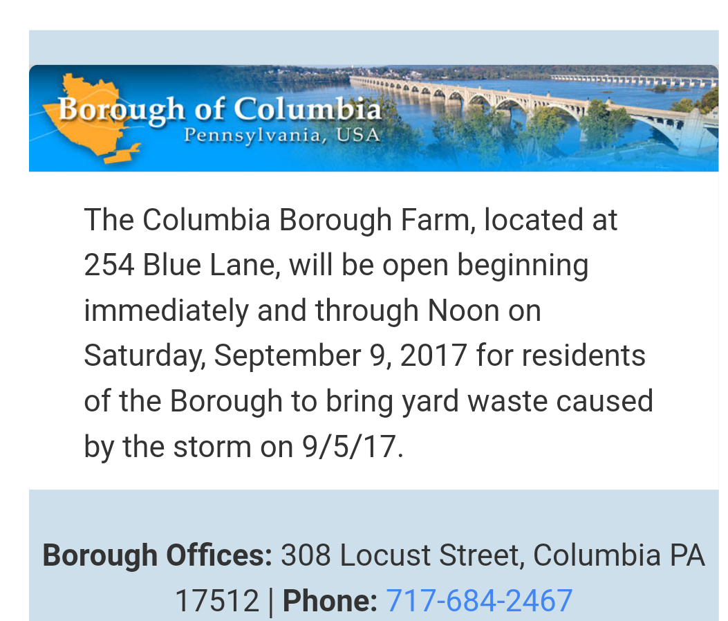 Columbia Borough Farm Open Due to Storm Share this: Click to share on X (Opens in new window) X Click to share on Facebook (Opens in new window) Facebook More Click to share on Bluesky (Opens in new window) Bluesky Click to share on X (Opens in new window) X Like Loading... Related