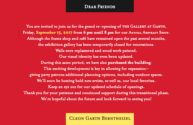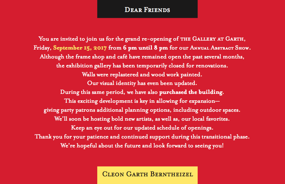 Grand Re-opening of The Gallery at Garth Friday, September 15 Share this: Share on X (Opens in new window) X Share on Facebook (Opens in new window) Facebook More Share on Bluesky (Opens in new window) Bluesky Share on X (Opens in new window) X Like Loading... Related