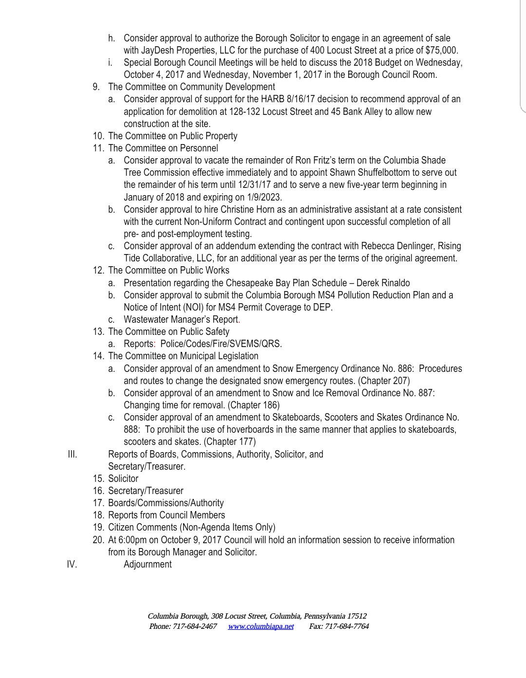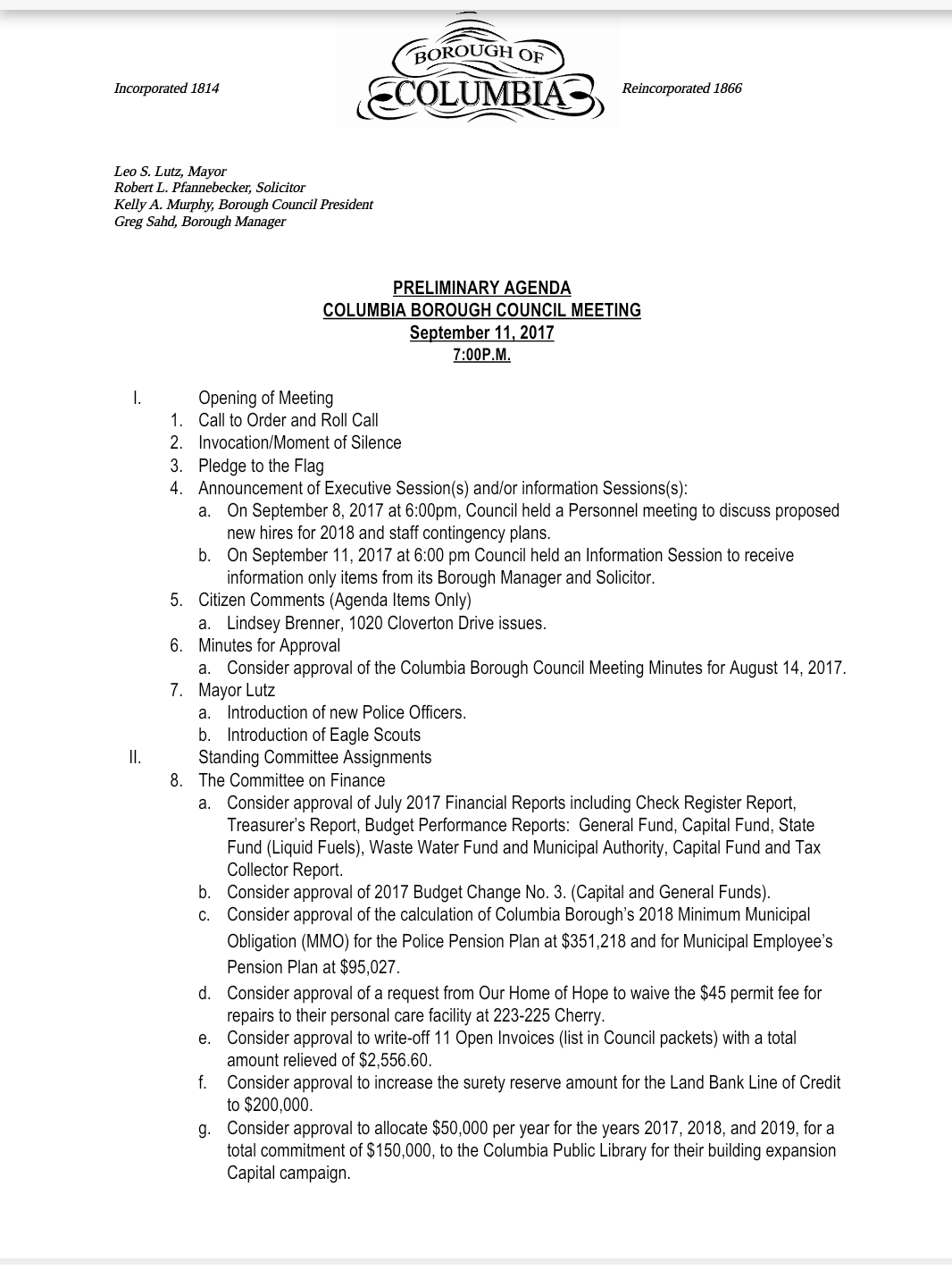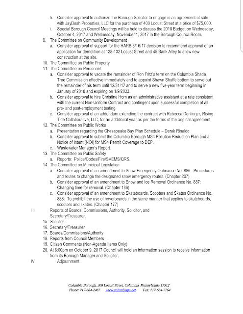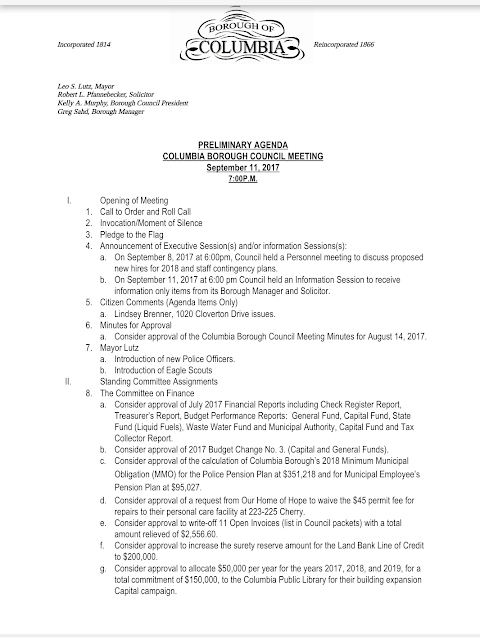 Draft Agenda – Columbia Borough Council Meeting, Sept. 11, 2017 Share this: Share on X (Opens in new window) X Share on Facebook (Opens in new window) Facebook More Share on Bluesky (Opens in new window) Bluesky Share on X (Opens in new window) X Like Loading... Related
