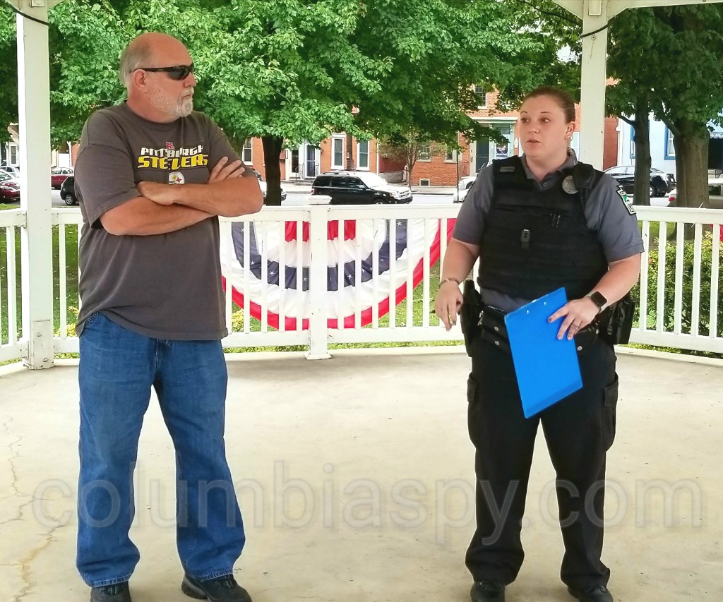 Over two dozen concerned citizens met at the gazebo in Locust Street Park Monday to voice concerns about crime and violence in the borough. Columbia resident Rick Fisher set up the meeting and was joined by Officer Amy Dittman of the Columbia Borough Police Department.