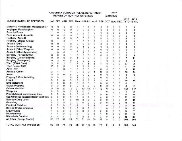 Columbia Borough Police Department Reports, Jan. thru Sept. 2017 Share this: Share on X (Opens in new window) X Share on Facebook (Opens in new window) Facebook More Share on Bluesky (Opens in new window) Bluesky Share on X (Opens in new window) X Like Loading... Related