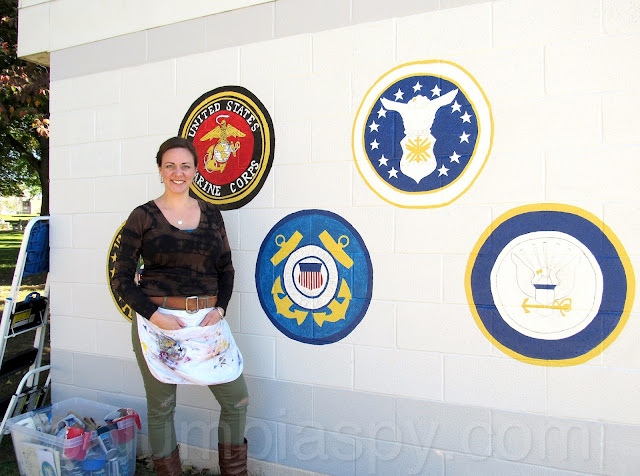 The mission is almost accomplished. Joanna Spicer hopes to complete her mural at Locust Street Park by the end of this weekend. Aided today by her mother – and some favorable weather – she worked for several hours daubing paint onto two more of the military emblems – navy and air force.