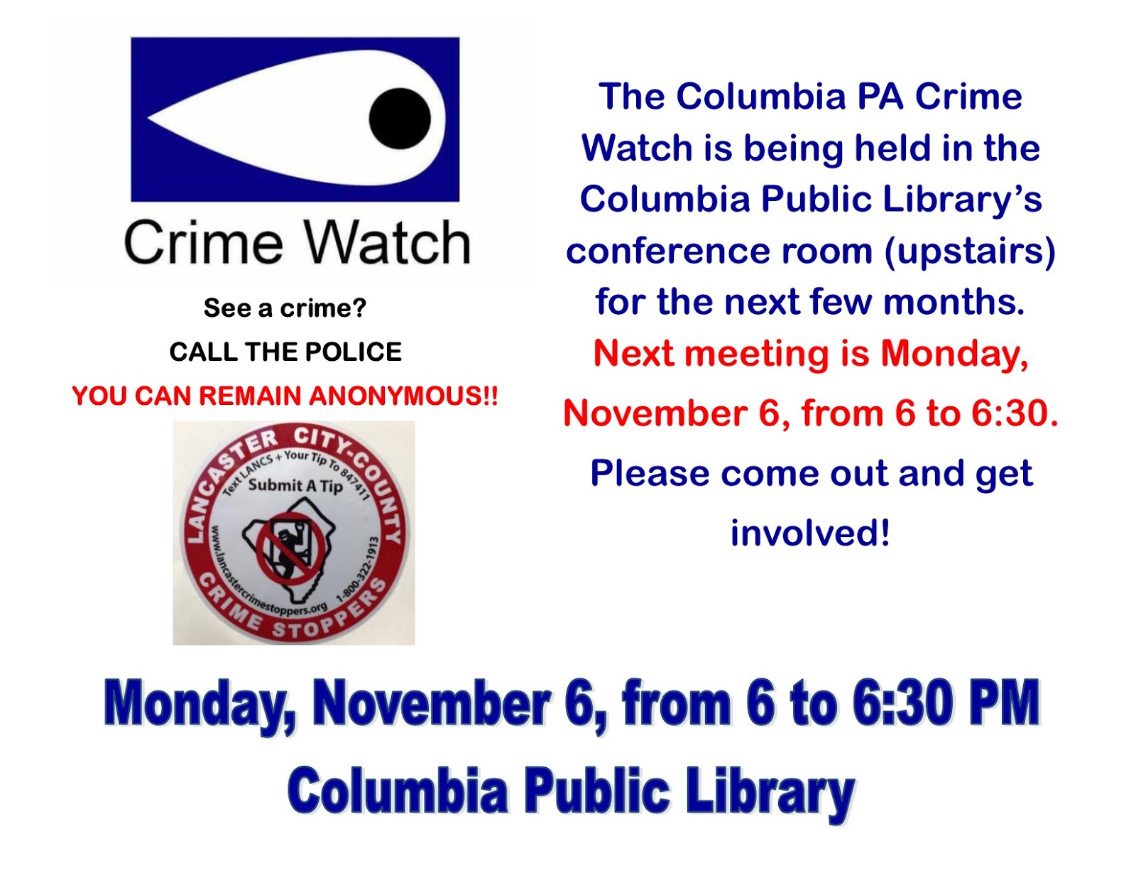 The Columbia Public Library is happy to be hosting the Columbia PA Crime Watch group for the cold weather months. The next meeting is Monday, November 6, from 6 to 6:30 PM – in our Conference Room upstairs.