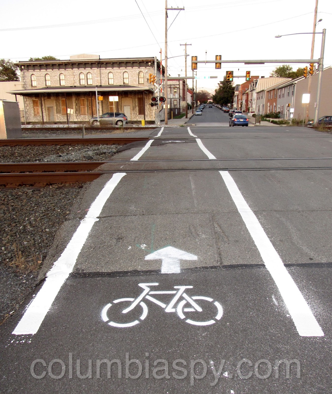 The Highway Department painted pedestrian walkway lines down at the tracks near River Park.