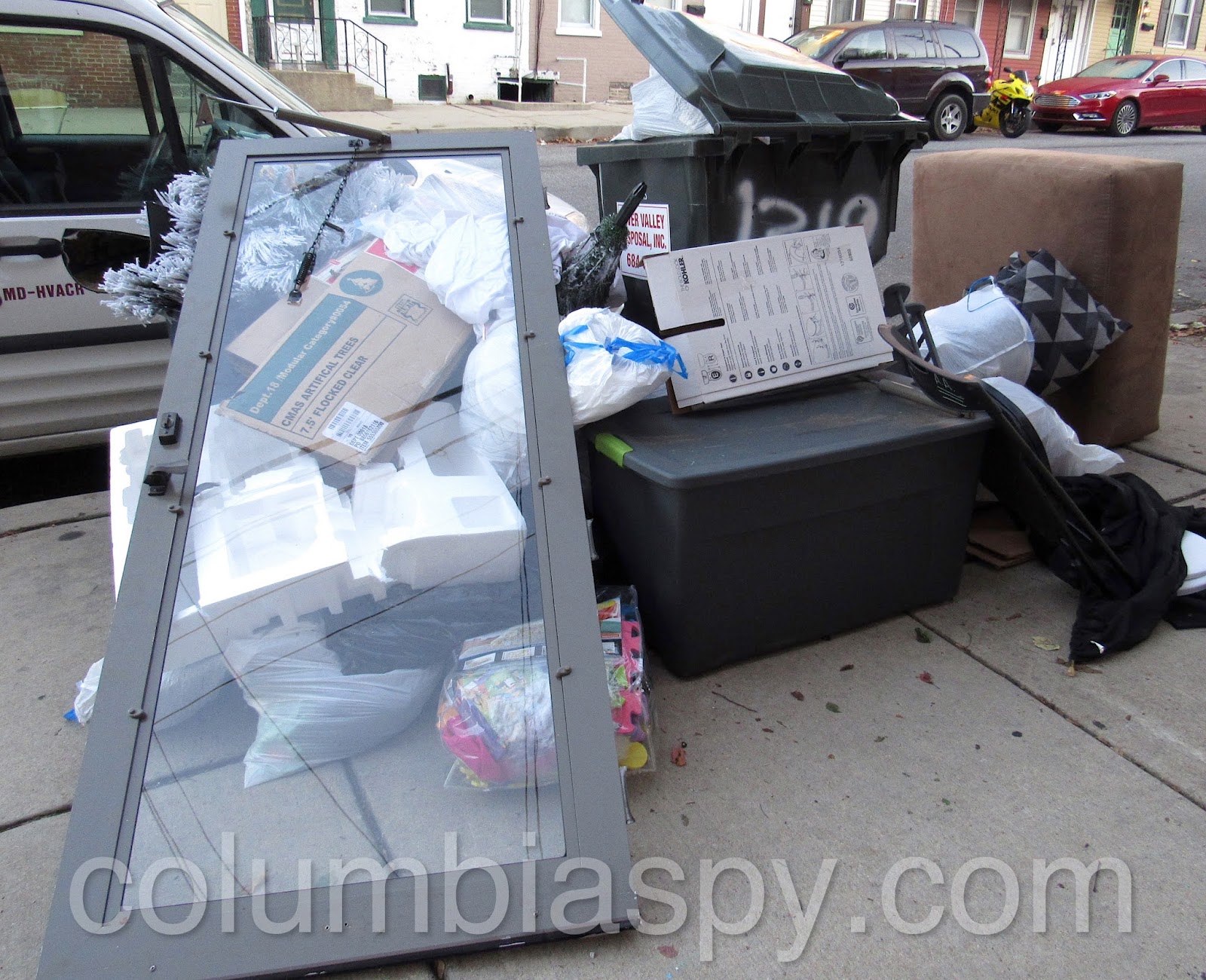 The photos shown below were taken this morning (Saturday, October 28), but the trash was there since at least yesterday. The pile includes miscellaneous furniture, bags of trash not in appropriate containers – and a storm door with a full pane of glass! The door takes up more than half the sidewalk and is a tripping hazard.