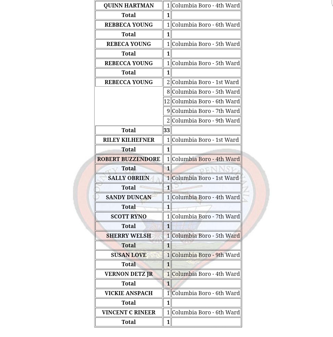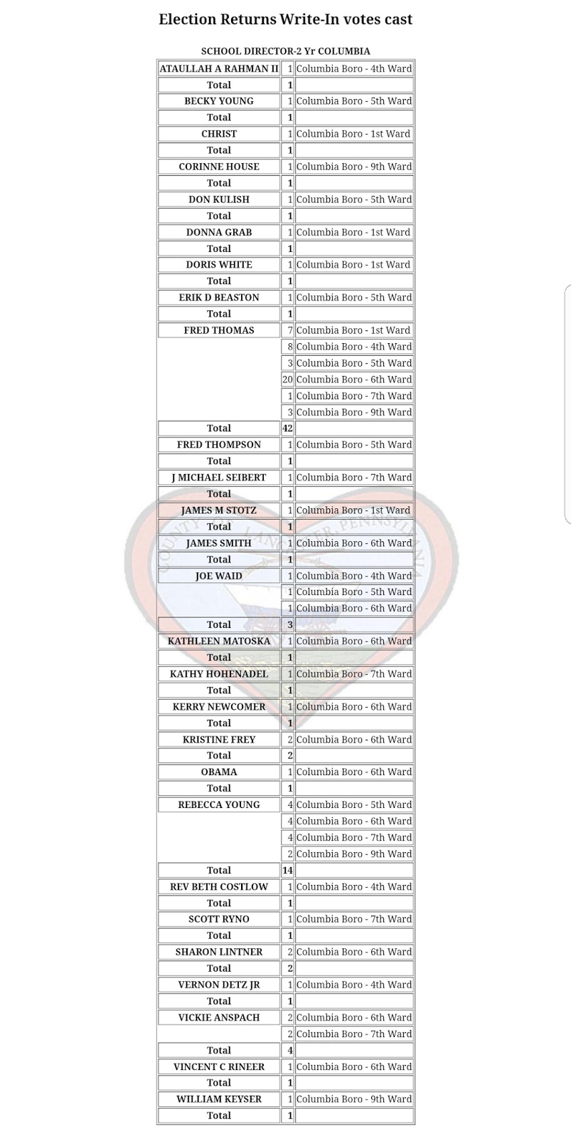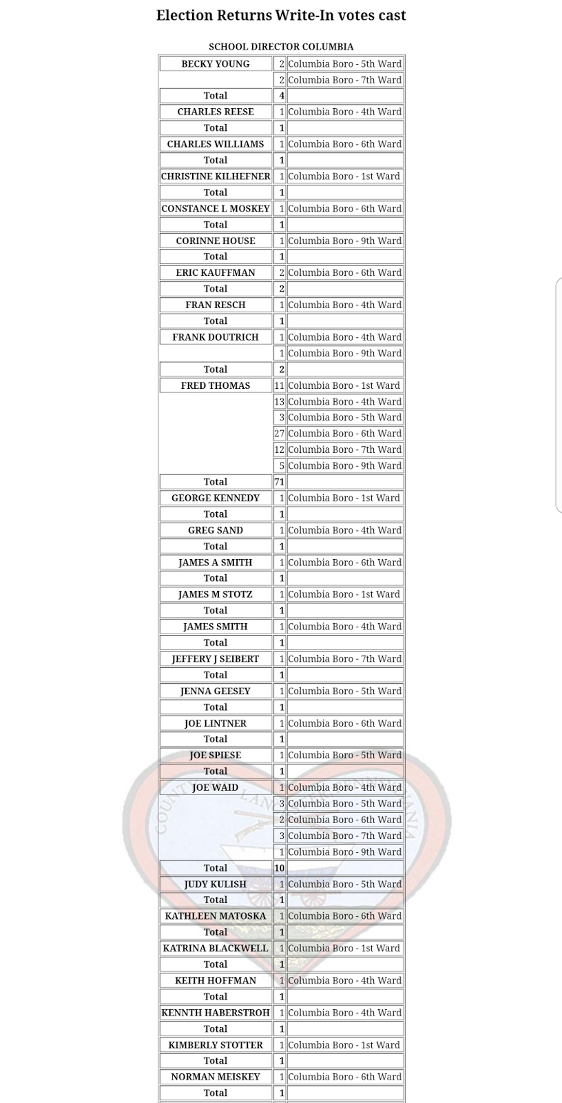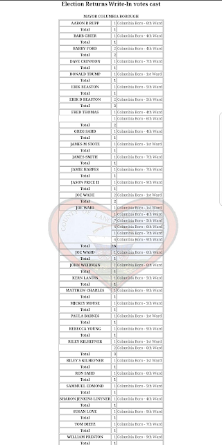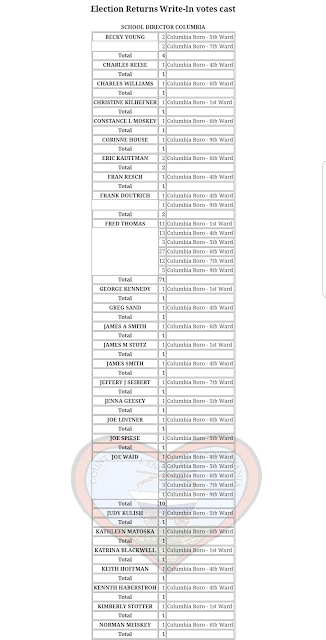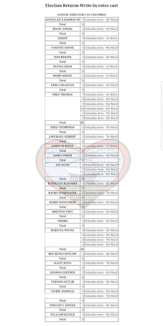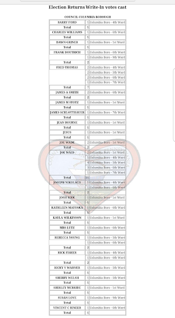 Election Returns Write-In Votes Cast – Columbia Click/tap on images for larger, sharper views: Share this: Share on X (Opens in new window) X Share on Facebook (Opens in new window) Facebook More Share on Bluesky (Opens in new window) Bluesky Share on X (Opens in new window) X Like Loading... Related