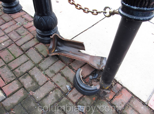 In a previous incident, a vehicle hit the plaza wall, dislodging several bricks (shown below) shortly after 6 o’clock Friday morning. A witness reported seeing a vehicle pulled over on Chestnut Street by a Columbia police officer. The vehicle was facing the wrong way on the 500 block of Chestnut, which is one-way.