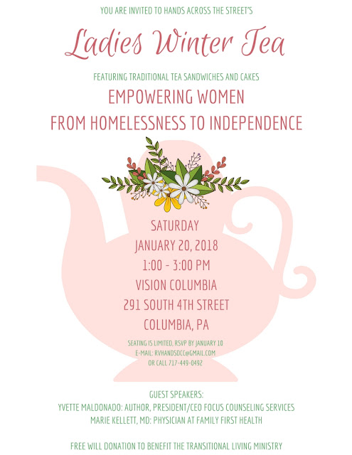 Family First Health is sponsoring a Ladies Winter Tea fundraising event for Hands Across the Street Homeless Shelter on Saturday, January 20, from 1 to 3 p.m. The event will be held at Vision Columbia, 291 South 4th Street. There will be food, a silent auction, and speakers.