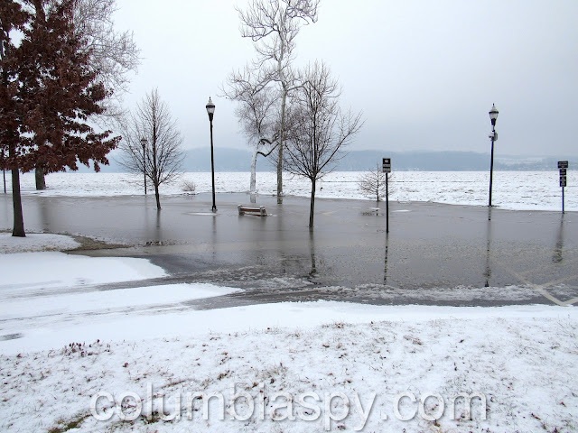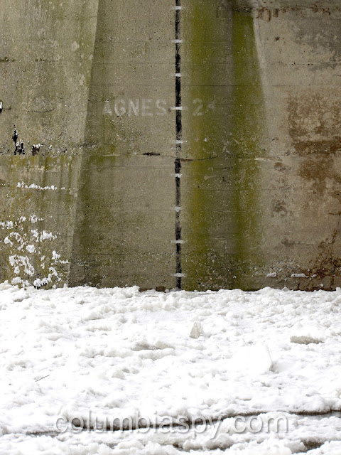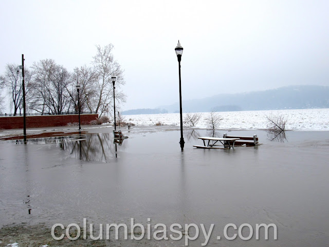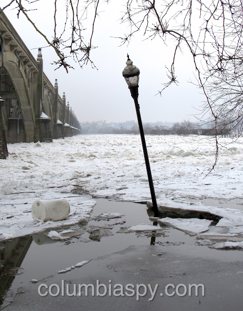 Ice jams, high water levels, and the sheer volume of ice floating down the Susquehanna have caused Columbia River Park to become flooded this morning (1/16/18). The painted scale on one of the piers of the Veterans Memorial Bridge shows the water level at 235 – eight feet above normal.