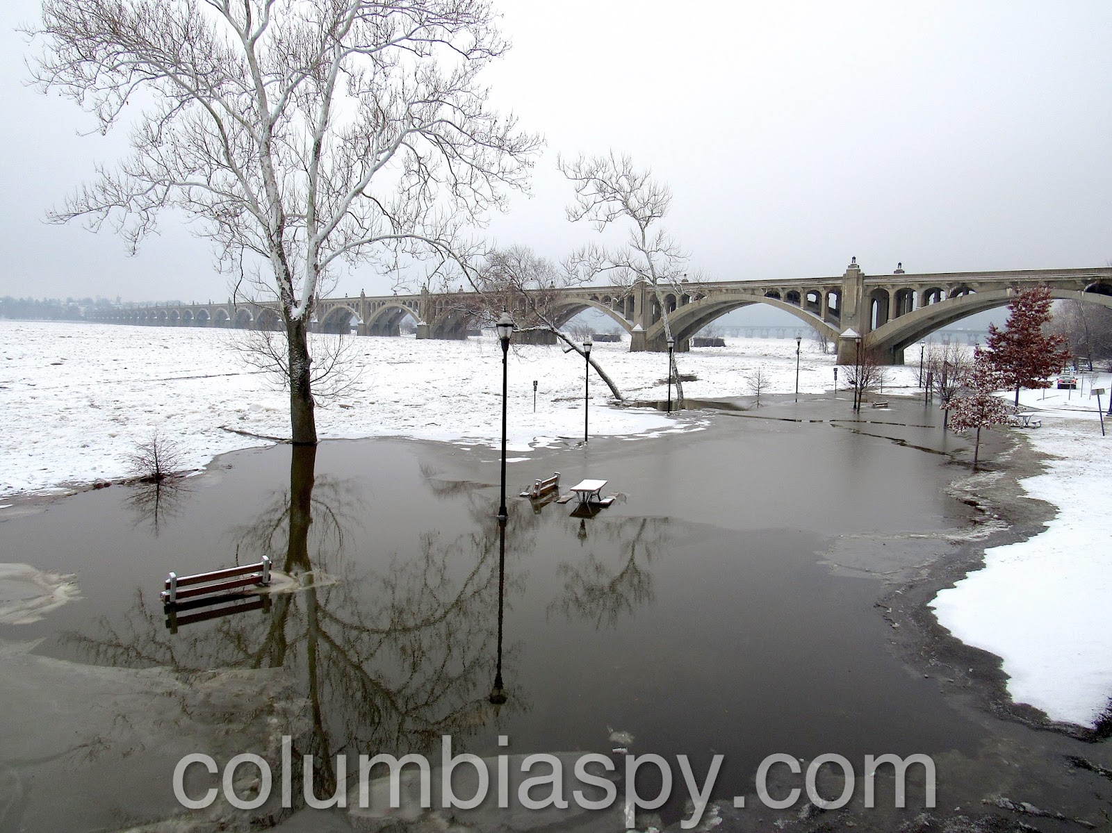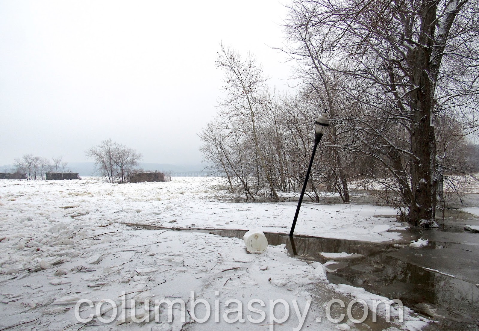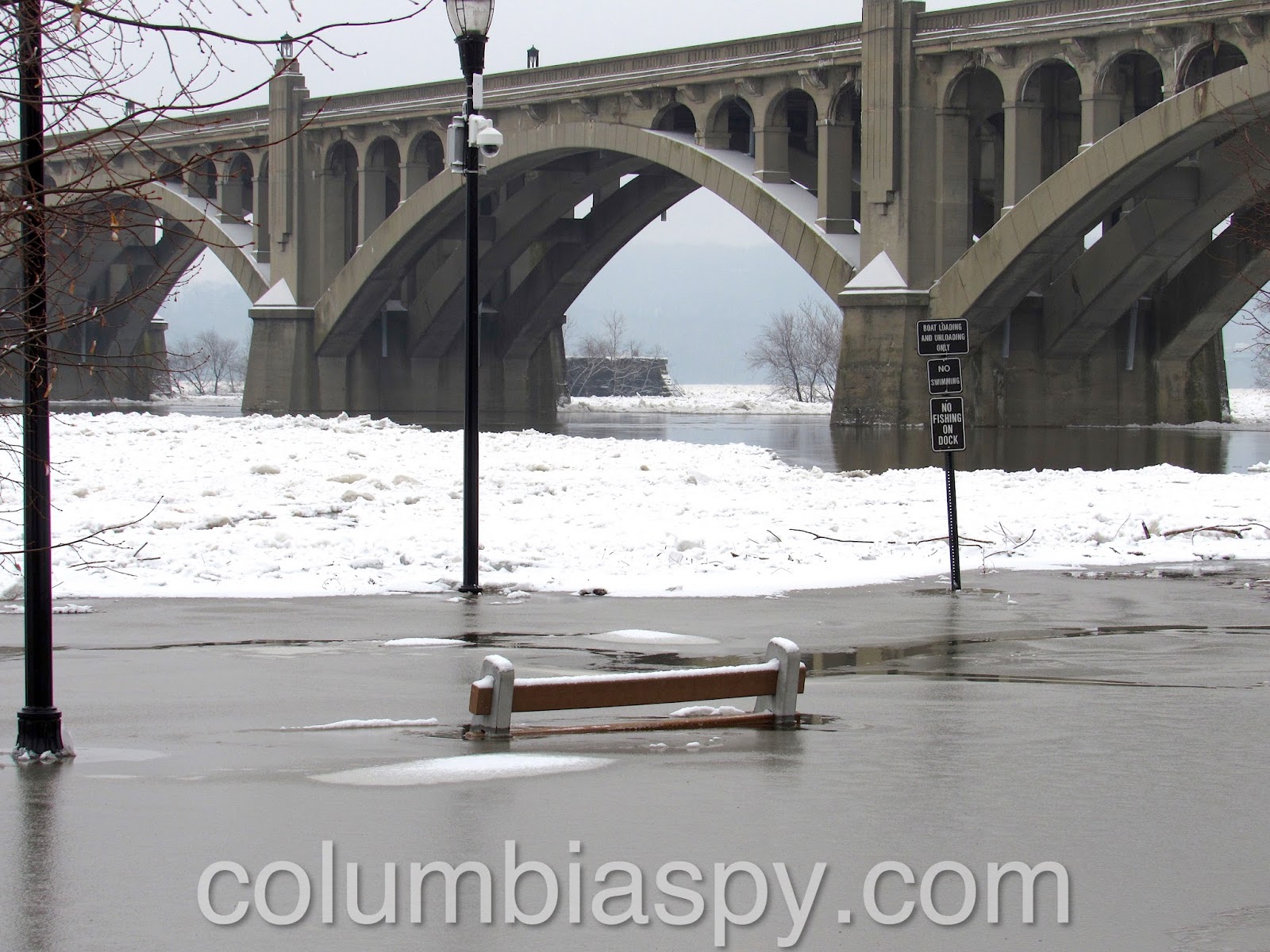 Ice jams, high water levels, and the sheer volume of ice floating down the Susquehanna have caused Columbia River Park to become flooded this morning (1/16/18). The painted scale on one of the piers of the Veterans Memorial Bridge shows the water level at 235 – eight feet above normal.
