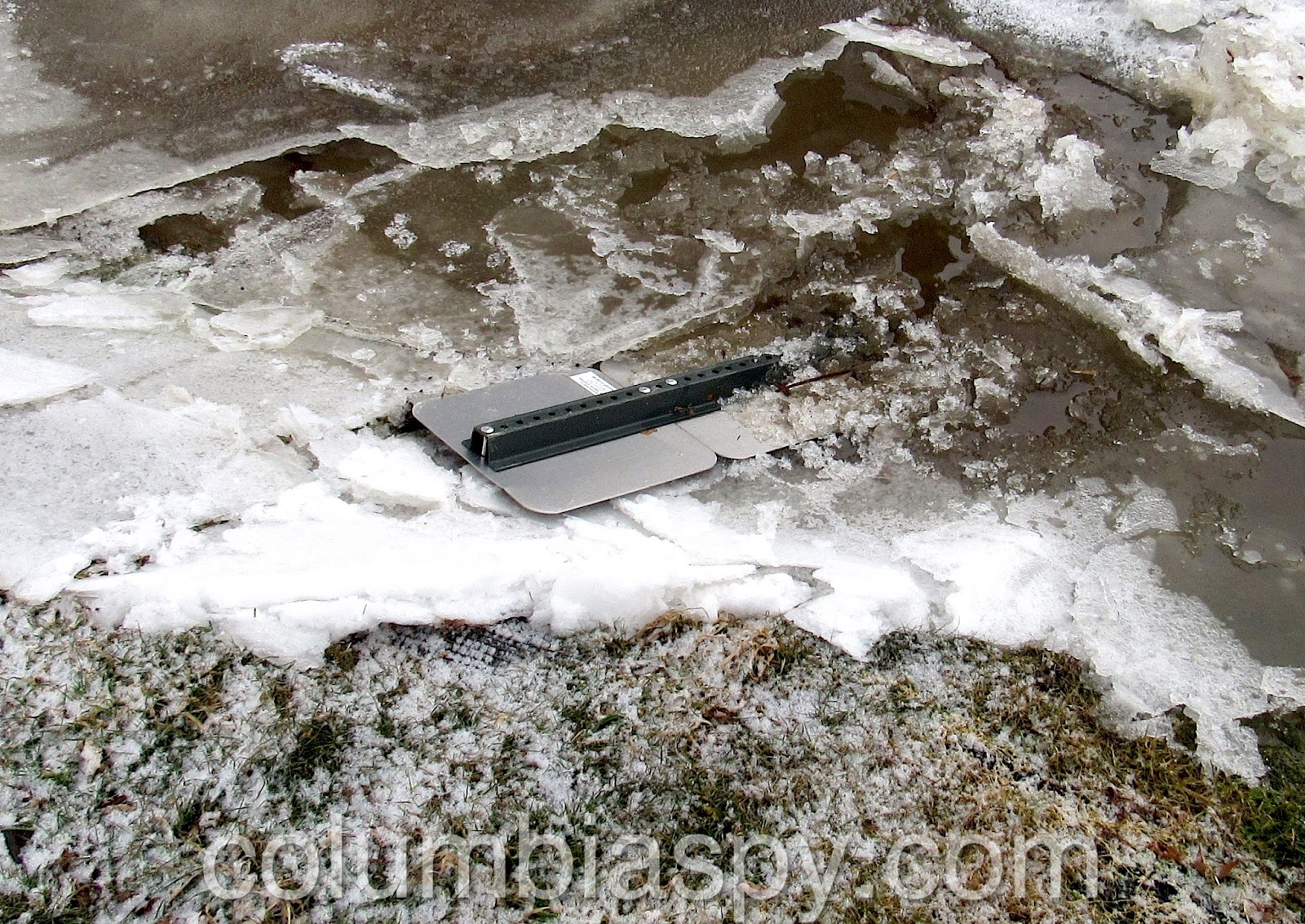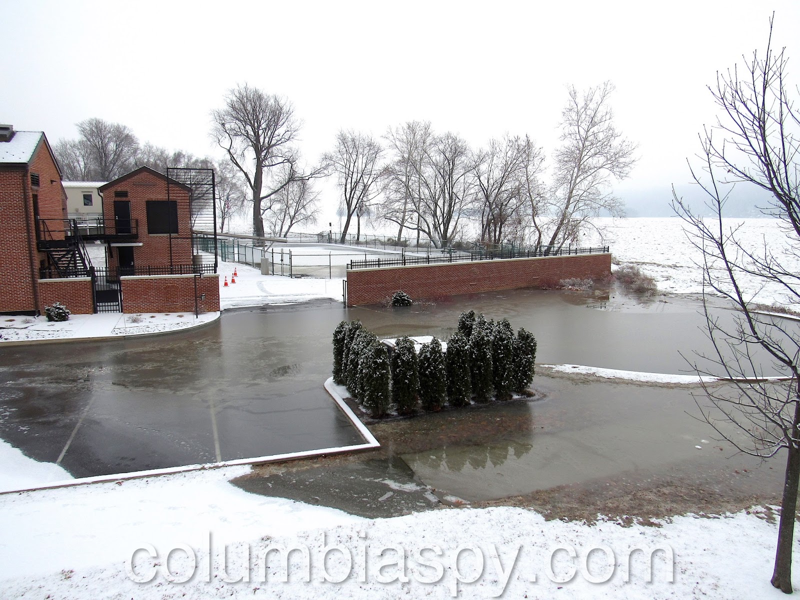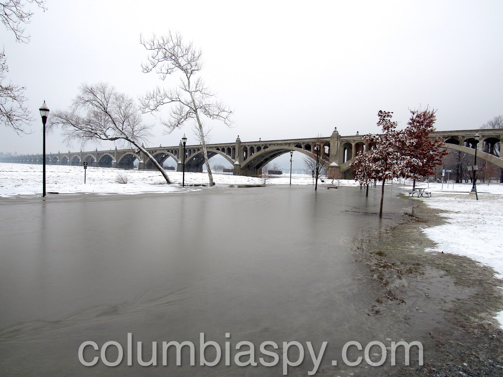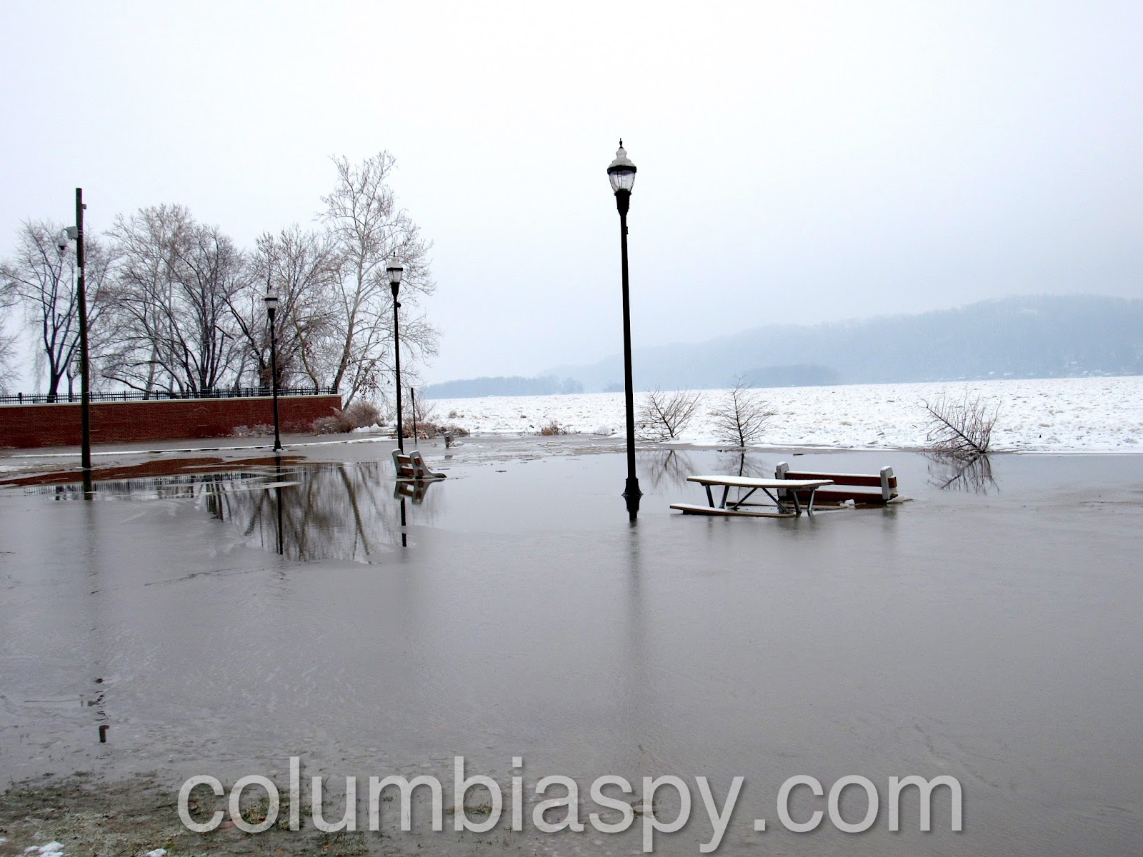 Ice jams, high water levels, and the sheer volume of ice floating down the Susquehanna have caused Columbia River Park to become flooded this morning (1/16/18). The painted scale on one of the piers of the Veterans Memorial Bridge shows the water level at 235 – eight feet above normal.