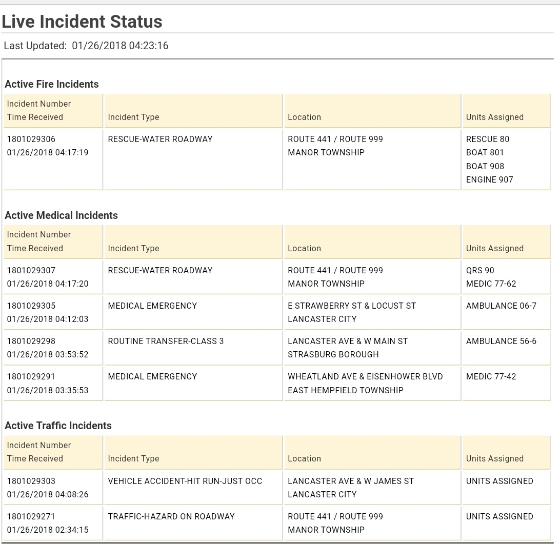 FRIDAY JANUARY 26, 2018, 4:17 AM: REPORTED WATER MAIN BREAK AT INTERSECTION OF ROUTES 441 & 999. VEHICLE IN WATER; PERSON TRAPPED.
