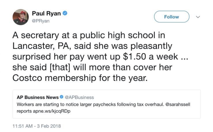 Ryan, linking to the AP story, presented Ketchum’s quote as benefit of the Republican tax overhaul, but then deleted the tweet after online criticism that touting such a small amount made him look out of touch.