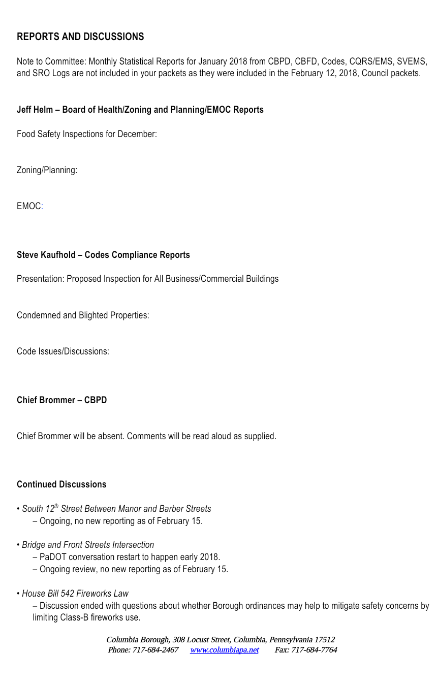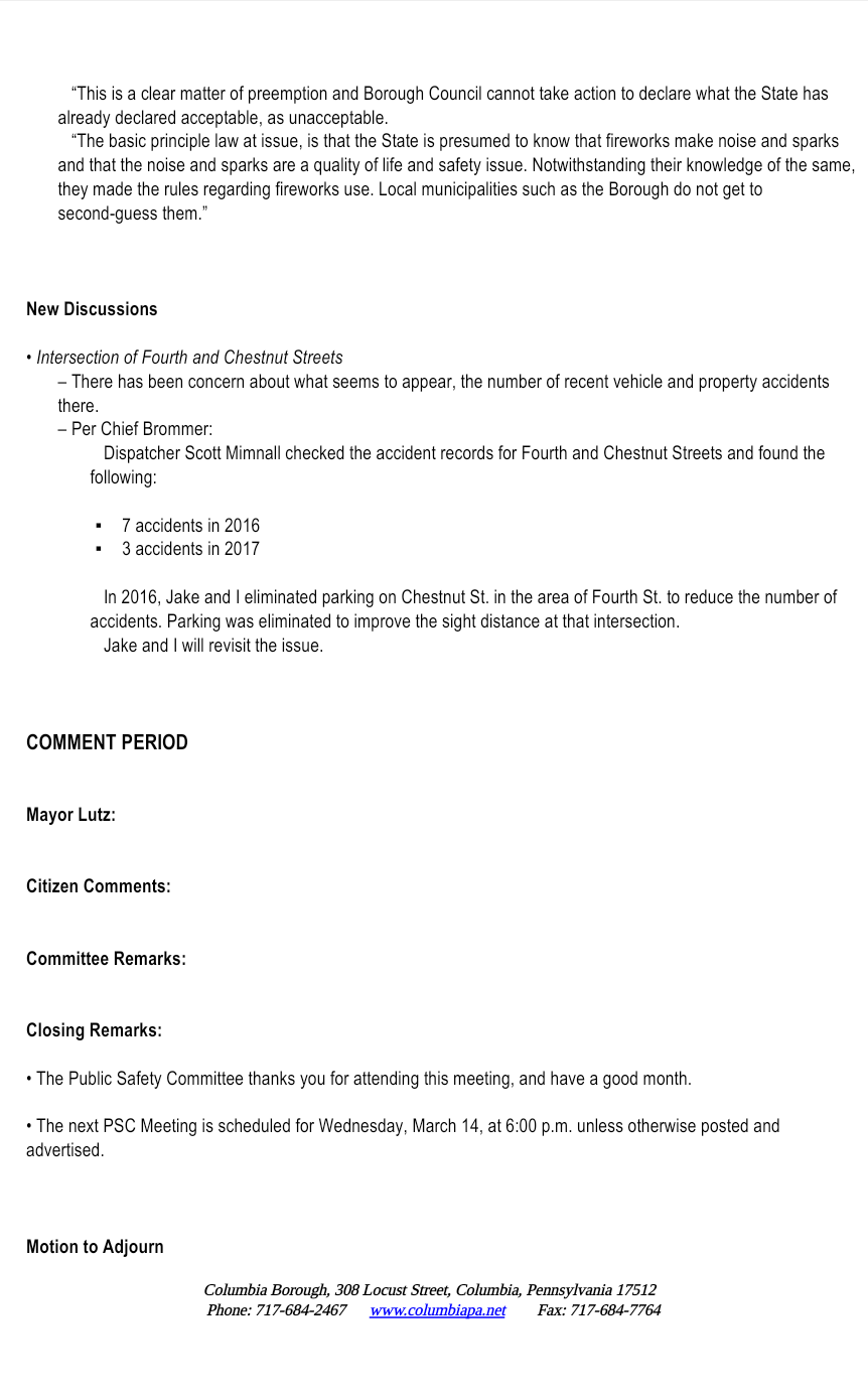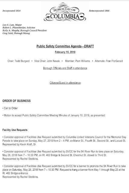 Draft Agenda – Safety Committee Meeting Feb. 15, 2018 Draft Agenda for Safety Committee Meeting February 15, 2018, at 6 p.m. at Borough Hall, 308 Locust Street, Columbia: Share this: Share on X (Opens in new window) X Share on Facebook (Opens in new window) Facebook More Share on Bluesky (Opens in new window) Bluesky Share on X (Opens in new window) X Like Loading... Related