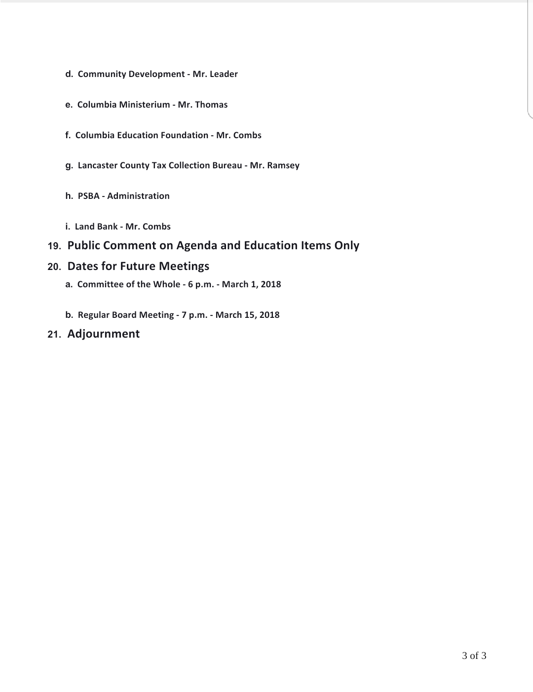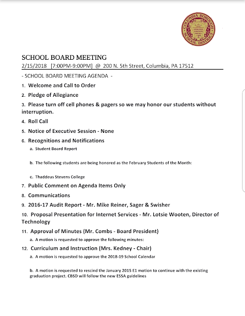 Draft Agenda – School Board Meeting Feb. 15, 2018 Draft Agenda for a Columbia Borough School Board meeting, February 15, 2018, at 7 p.m. at the District Administration Center, 200 North Chestnut Street: Share this: Share on X (Opens in new window) X Share on Facebook (Opens in new window) Facebook More Share on Bluesky (Opens in new window) Bluesky Share on X (Opens in new window) X Like Loading... Related
