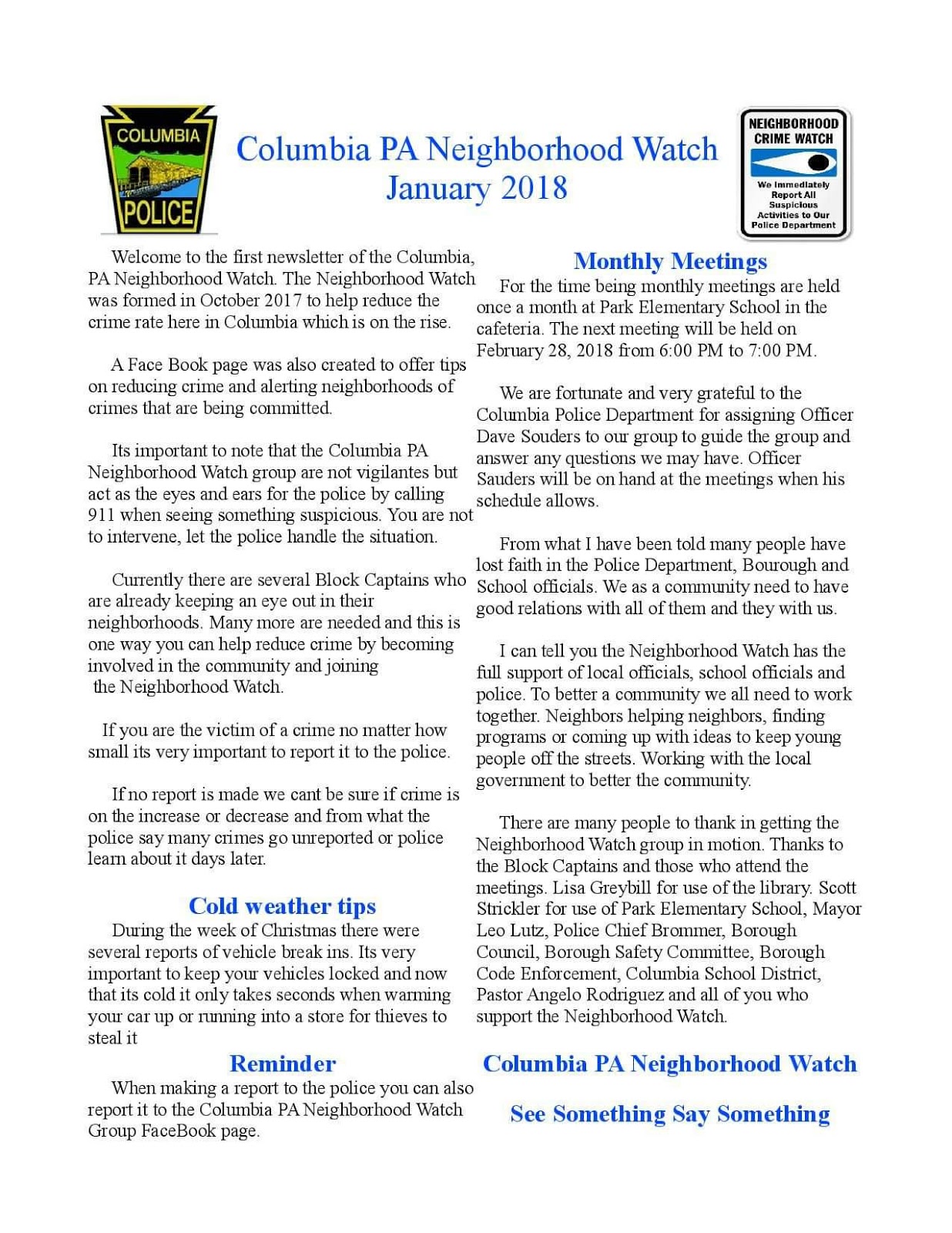 0 thoughts on “Columbia PA Neighborhood Watch group releases 1st newsletter”